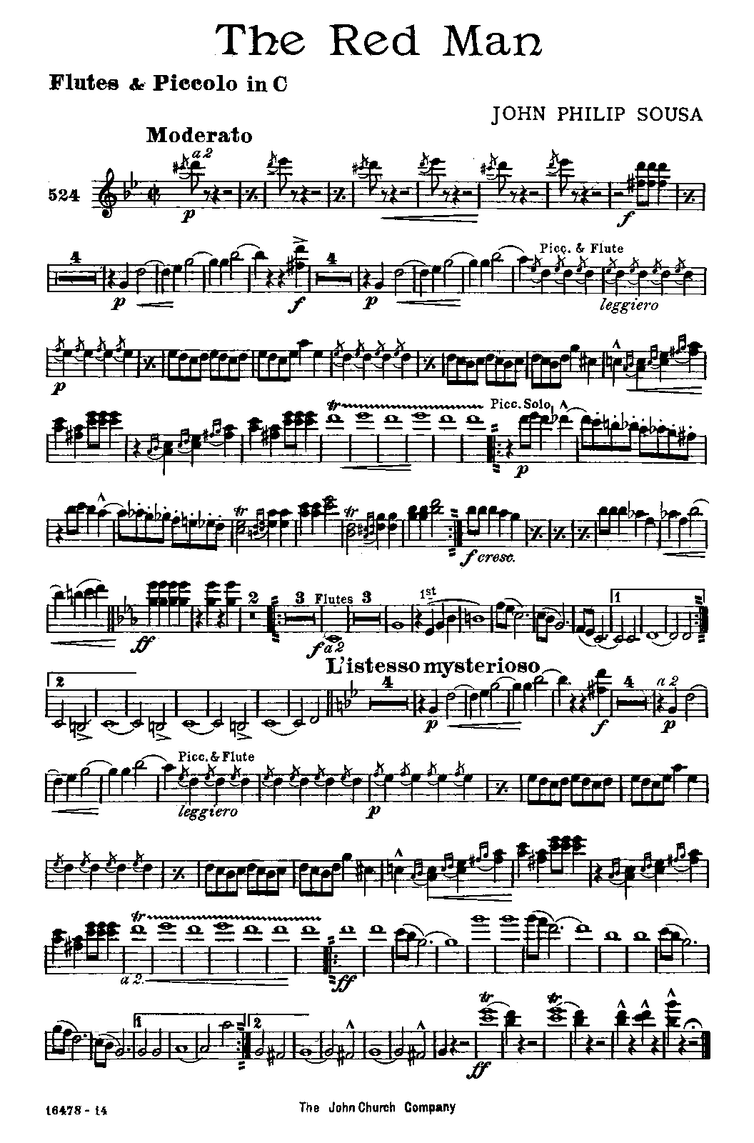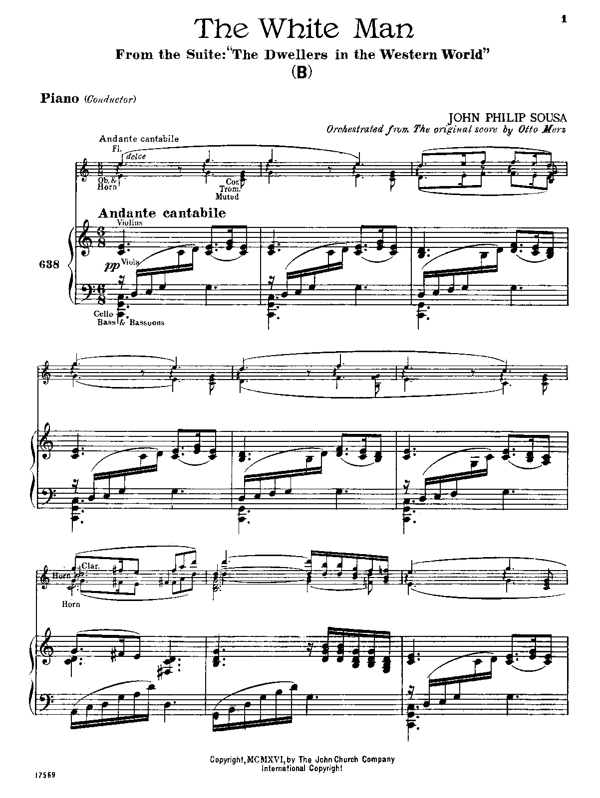 Original images: 300dpi, color tif files approx. 2220 by 3460 pixels. Editing: re-sampled to 600dpi, converted to black and white tif files, de-skewed, and set uniform margins. The solo B♭ cornet part also serves as the conductor score. Source of Files: The Red Man, The White Man, The Black Man. Parts listing for The Red Man: Flutes+piccolo, 1st+2nd oboes, 1st+2nd bassoons, E♭ clarinet, 1st B♭ clarinet solo, 2nd+3rd B♭ clarinets, alto clarinet, bass clarinet, alto, tenor and baritone saxophones, E♭ cornet, B♭ cornet solo, 1st B♭ cornet, 2nd+3rd B♭ cornets, 1st+2nd E♭ horns, 3rd+4th E♭ horns, baritone, euphonium, 1st trombone, 2nd+3rd trombones, basses, drums+timpani+tom tom+tambo, 1st+2nd tenors, B♭ basses