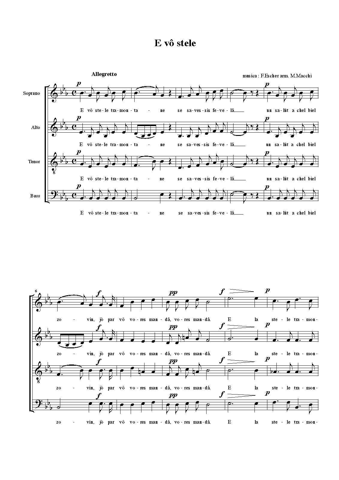 Apart from collecting folk songs, Escher also composed villotte, specifically for choirs, along the lines of popular Friulian songs, so this is likely male chorus rather than solo voices. Mr. Macchi's arrangement says "arm. M. Macchi". It is unclear what the nature of the harmonization is that would be different from Escher's original; perhaps the only difference is that it is for mixed chorus rather than male chorus.