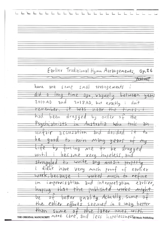 | Extra Information | arrangements of some of the hymns that i heard, and for a while played at on the organ for the mass. arranging the hymns was found a beneficial way to improve in composition, in those times i had become very slow, however, because around that time i was very drugged, and it took a long time to write things at any acceptable quality or rate, often stumbling in various ways. |