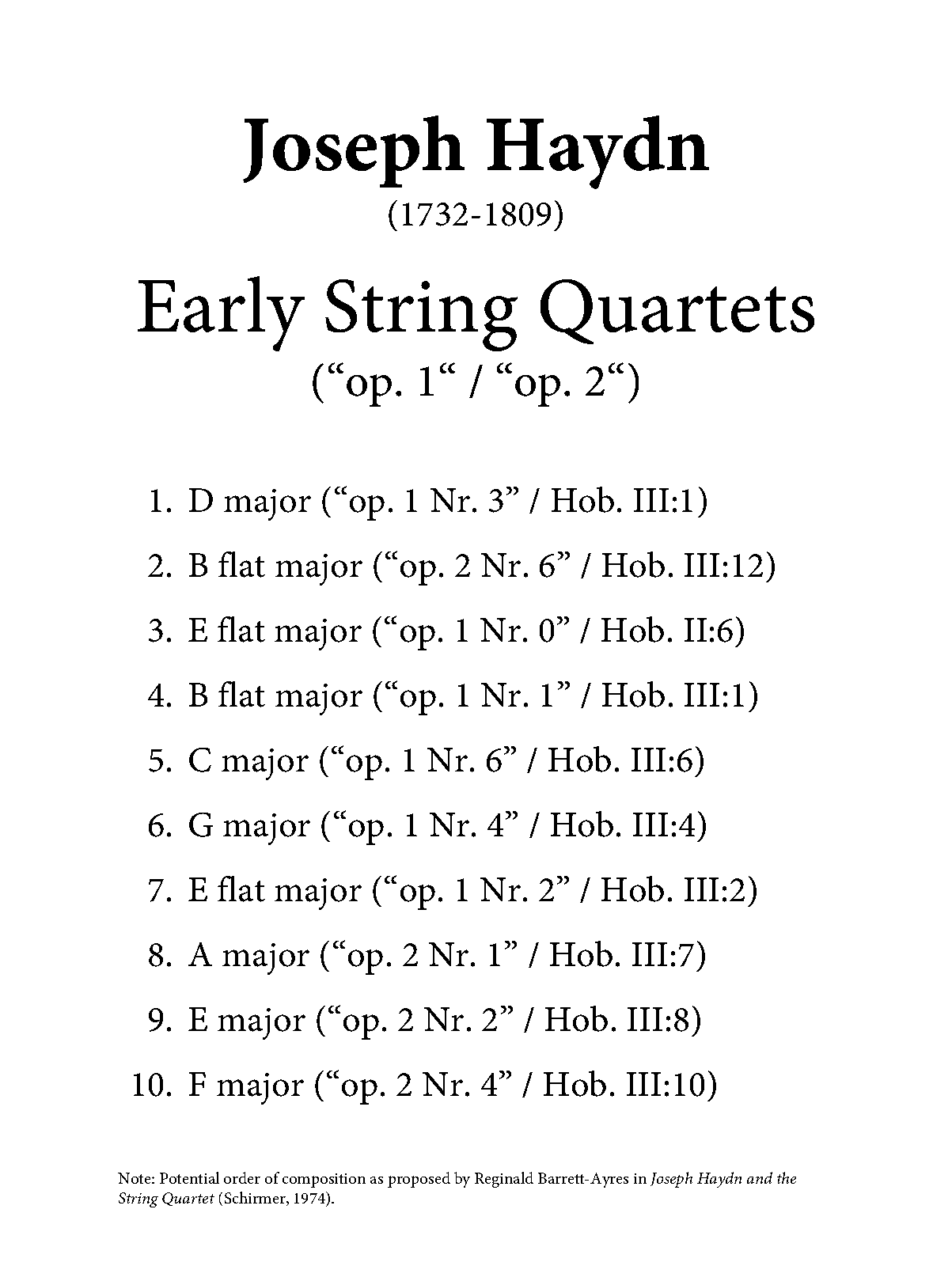 | Opus/Catalogue NumberOp./Cat. No. | Op.1: Nos.0-4, 6, Op.2: Nos.1-2, 6 ; Hob.II:6, Hob.III:1-4, 6-8, 10, 12 |