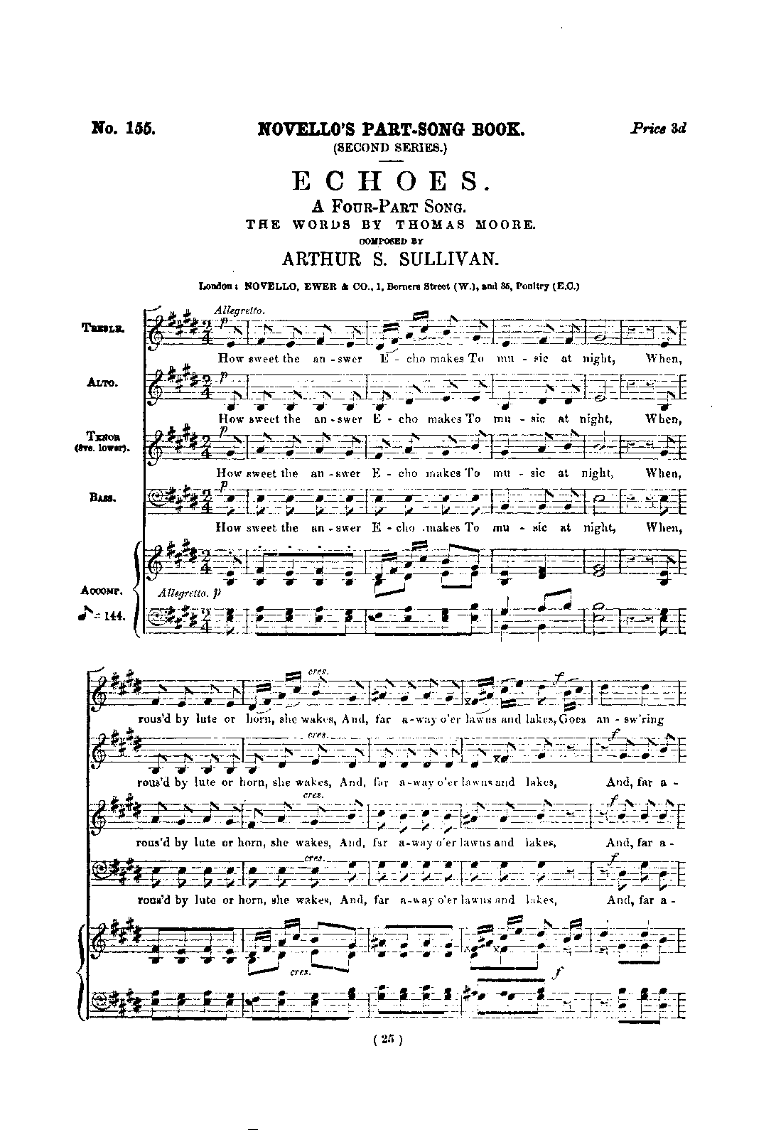 Musical Times December 1870 page 726 lists Novello Part-Song Book as including all of the "Six Songs by A.S. Sullivan," including "Echoes". So by 1870, but probably earlier.