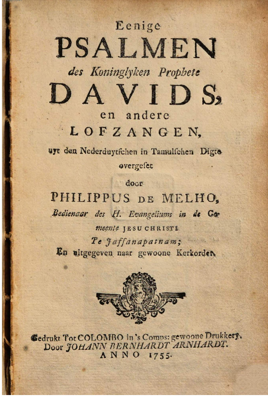 Eenige Psalmen des Koninglyken Prophete Davids, en andere Lofzangen, uyt den Nederduytschen in Tamulschen Digte overgeset door Philippus de Melho, Bedienaar des H. Evangeliums in de Gemeente Jesu Christi te Jaffanapatnam; En uitgegeven naar gewoone Kerkorden