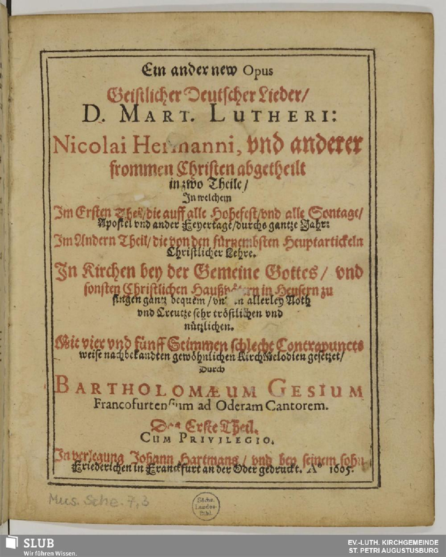 Ein ander new Opus Geistlicher Deutscher Lieder, D. Mart. Lutheri: Nicolai Hermanni, vnd anderer frommen Christen abgetheilt in zwo Theile, In welchem Im Ersten Theil, die auff alle Hohefest, vnd alle Sontage, Apostel vnd ander Feyertage, durchs gantze Jahr: Im Andern Theil, die von den fürnembsten Heuptartickeln Christlicher Lehre. In Kirchen bey der Gemeine Gottes, vnd sonsten Christlichen Haußvätern in Heusern zu singen gantz bequem, vnd in allerley Noth vnd Creutze sehr tröstlichen vnd nützlichen. Mit vier vnd fünff Stimmen schlecht Contrapuncts weise nach bekandten gewöhnlichen Kirch Melodien gesetzet, Durch Bartholomaeum Gesium; Gesangbuch