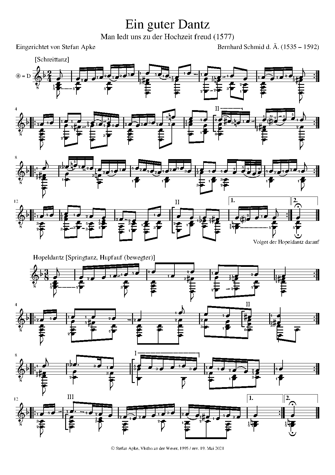 This piece is from the collection Einer Neuen Kunstlichen Tabulatur . . . allen Organisten und angehenden Instrumentisten zu nutz. Grove Music comments: "As the full title indicates, Schmid intended his book for all kinds of keyboard instruments. The book serves as an index of the type of keyboard music performed at that time in church and in the home."