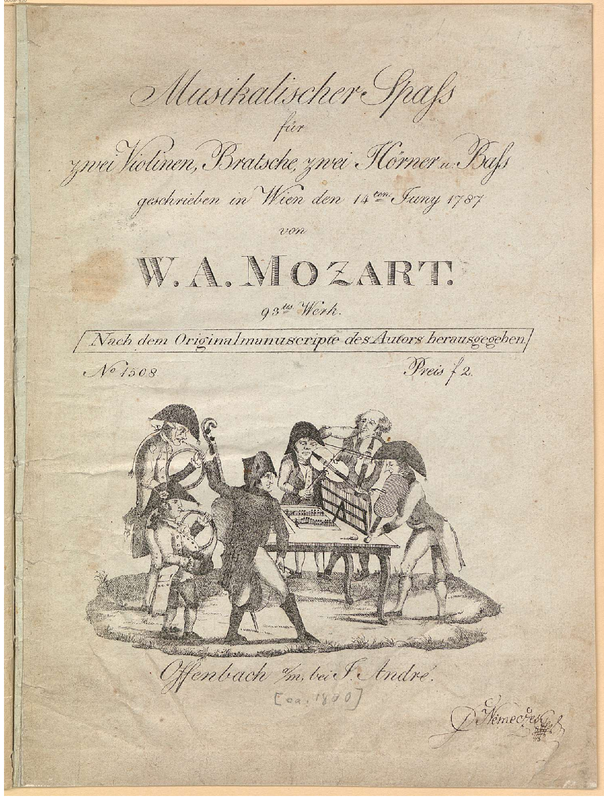 Misc. Notes Musikalischer Spaß für zwei Violinen, Bratsche, zwei Hörner u: Baß geschrieben in Wien den 14ten Juny 1787 von W. A. Mozart. 93tes Werk. Nach dem Originalmanuscripte des Autors herausgegeben.