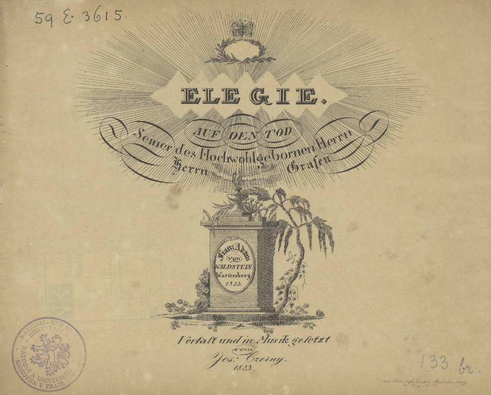 | Alternative. Title | Elegie auf den Tod Seiner des Hochwohlgebornen Herrn Herrn Grafen Franz Adam von Waldstein Wartenberg 1823. Verfasst und in Musik gesetzt von Jos: Czerny. 1823 |
