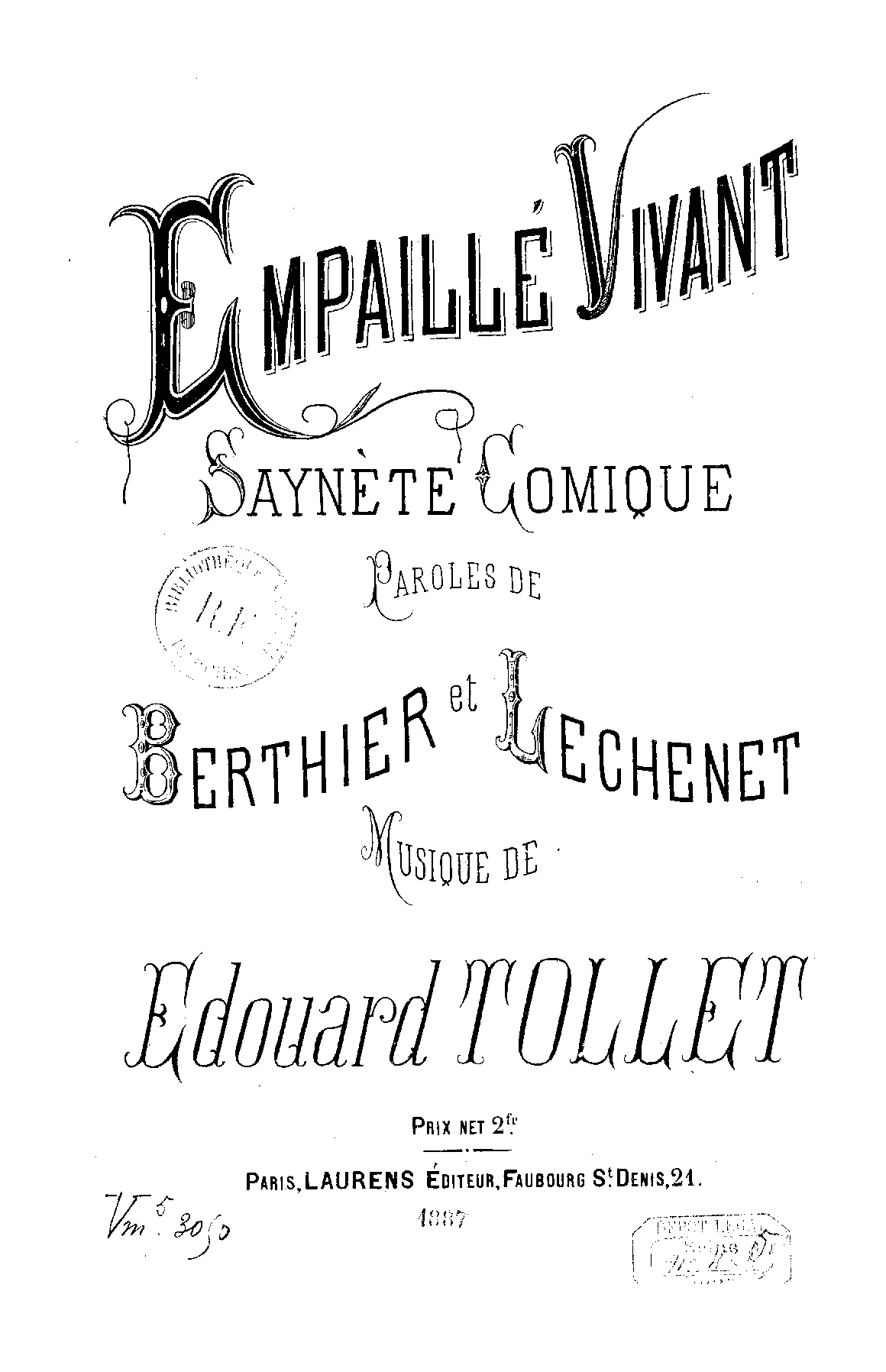 | Copyright Information | Publication noted in the Bibliographie de la France : 76e année, 2e série, Nº 45, 5 Novembre 1887, p.687, reg.4439 (vocal score). |
