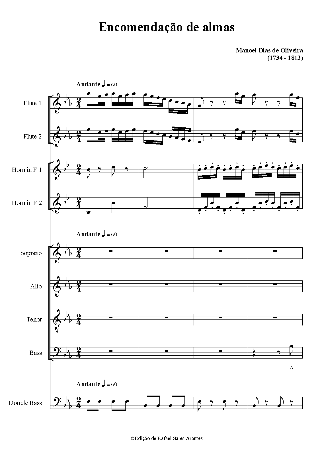 ENCOMENDAÇÃO DAS ALMAS: solenidade da religiosidade popular, não litúrgica, realizada nas noites de sexta-feira da Quaresma, para rezar pelas almas dos mortos. O cortejo, até muito recentemente composto exclusivamente por homens, caminha rezando em voz baixa, carregando velas acesas e tocando matraca, parando em lugares pré-estabelecidos (cemitérios, cruzeiros ou encruzilhadas). Em cada parada canta-se uma música, reza-se (Pai Nosso, Ave Maria e Glória ao Pai) e canta-se o “Senhor Deus”. Em São João Del Rei, única cidade onde esta tradição é guardada, um dos Motetos de Passos é cantado em cada parada, em substituição à obra que, no passado, era específica dessa solenidade (como o Encomendação das Almas, de Manoel Dias de Oliveira). Quando mulheres não participavam do cortejo, as partes de soprano e contralto eram cantadas pelos homens, em falsete.