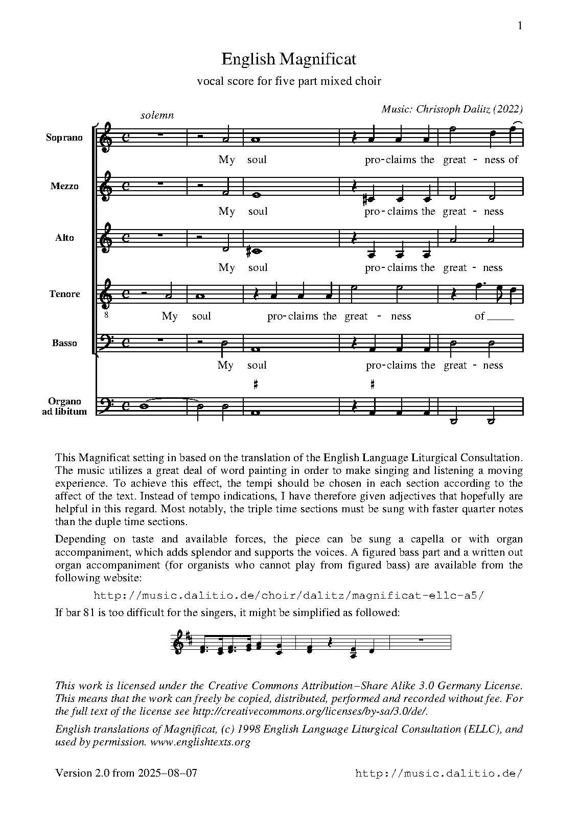 | Extra Information | This Magnificat setting in based on the translation of the English Language Liturgical Consultation (ELLC). The music utilizes a great deal of word painting in the polyphonc style of the early baroque, which makes singing and listening a powerful experience. |