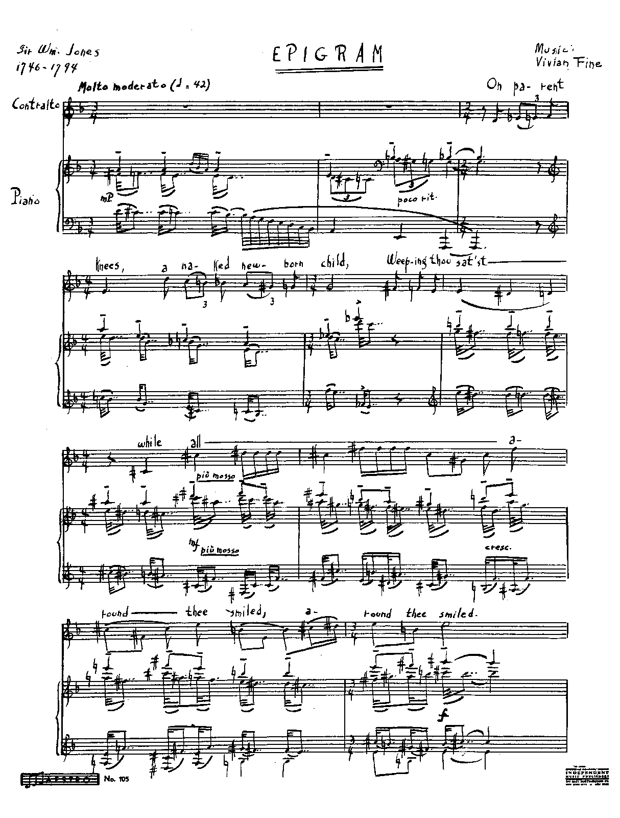 Fine expressed her feelings [about World War II] in two song collections. The first consists of two songs, “Epigram,” and “Epitaph: upon the death of Sir Albert Morton’s Wife,” on texts by Sir William Jones (1746-1794) and Sir Henry Wotton (1568-1639). Epigram is a parent’s hope that a baby will live, and Epitaph is a statement about a wife who died not long after her husband’s death. She wrote the second collection, Songs of Our Times (1943), for a concert that Lazare Saminsky produced at the Temple Emmanuel in New York to support the Russian/American efforts in the war.