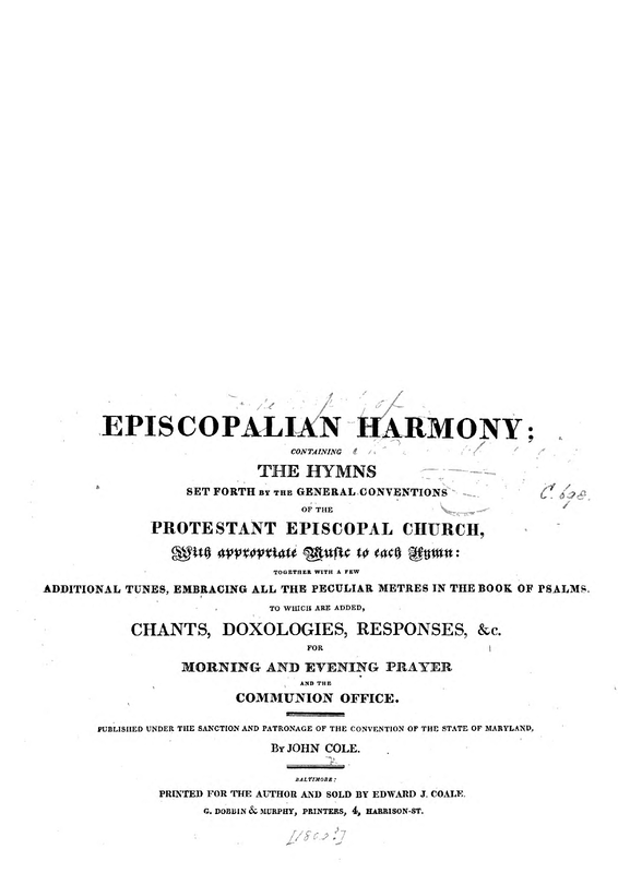 | Alternative. Title | Episcopalian Harmony; containing the hymns set forth by the General Conventions of the Protestant Episcopal Church, with appropriate Music to each Hymn: together with a few additional tunes, embracing all the peculiar metres in the book of psalms, to which are added, chants, doxologies, responses, &c. for morning and evening prayer and the communion office. |