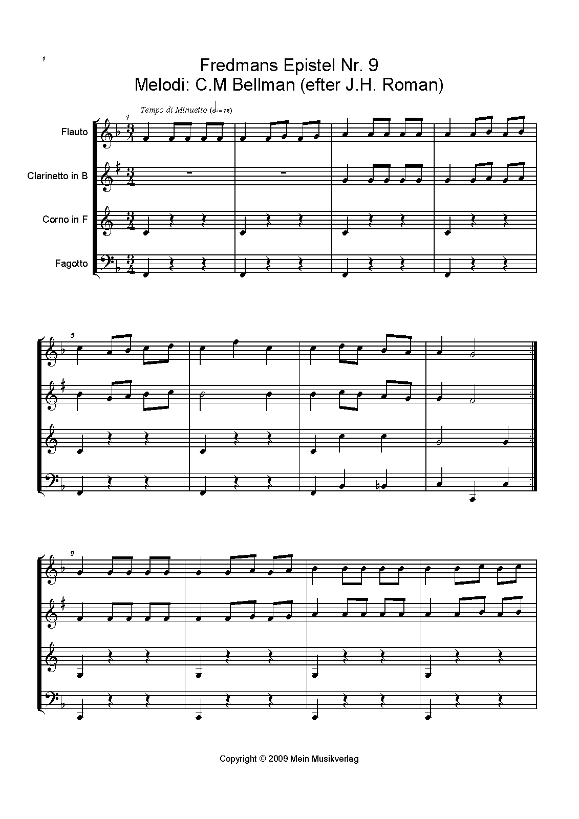 Misc. Notes Arrangement of Fredmans Epistle No 9 for Flute, Clarinet (B), Horn (F) and Bassoon.