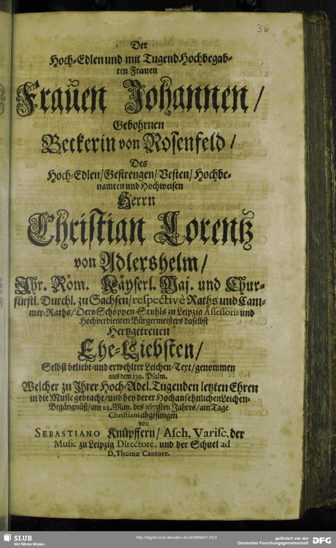 Der Hoch-Edlen und mit Tugend Hochbegabten Frauen Frauen Johannen, Gebohrnen Beckerin von Rosenfeld, Des Hoch-Edlen, Gestrengen, Vesten, Hochbenamten und Hochweisen Herrn Christian Lorentz von Adlershelm, Ihr. Röm. Käyserl. Maj. und Churfürstl. Durchl. zu Sachsen, respective Raths und Cammer-Raths, Dero Schöppen-Stuhls zu Leipzig Assessoris und Hochverdienten Bürgermeisters daselbst Hertzgetreuen Ehe-Liebsten, Selbst beliebt- und erwehlter Leichen-Text genommen aus dem 139. Psalm. Welcher zu Ihere Hoch-Adel. Tugenden letzten Ehren in die Music gebracht, und bey derer Hochansehnlichen Leichen-Begängnüß, am 14. May. es 1673sten Jahres, am Tage Christiani abgesungen von Sebastiano Knüpffern, Asch. Varisc. der Music zu Leipzig Directore, und der Schuel as D. Thomæ Cantore.