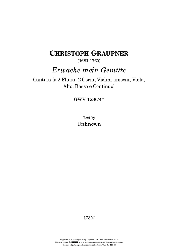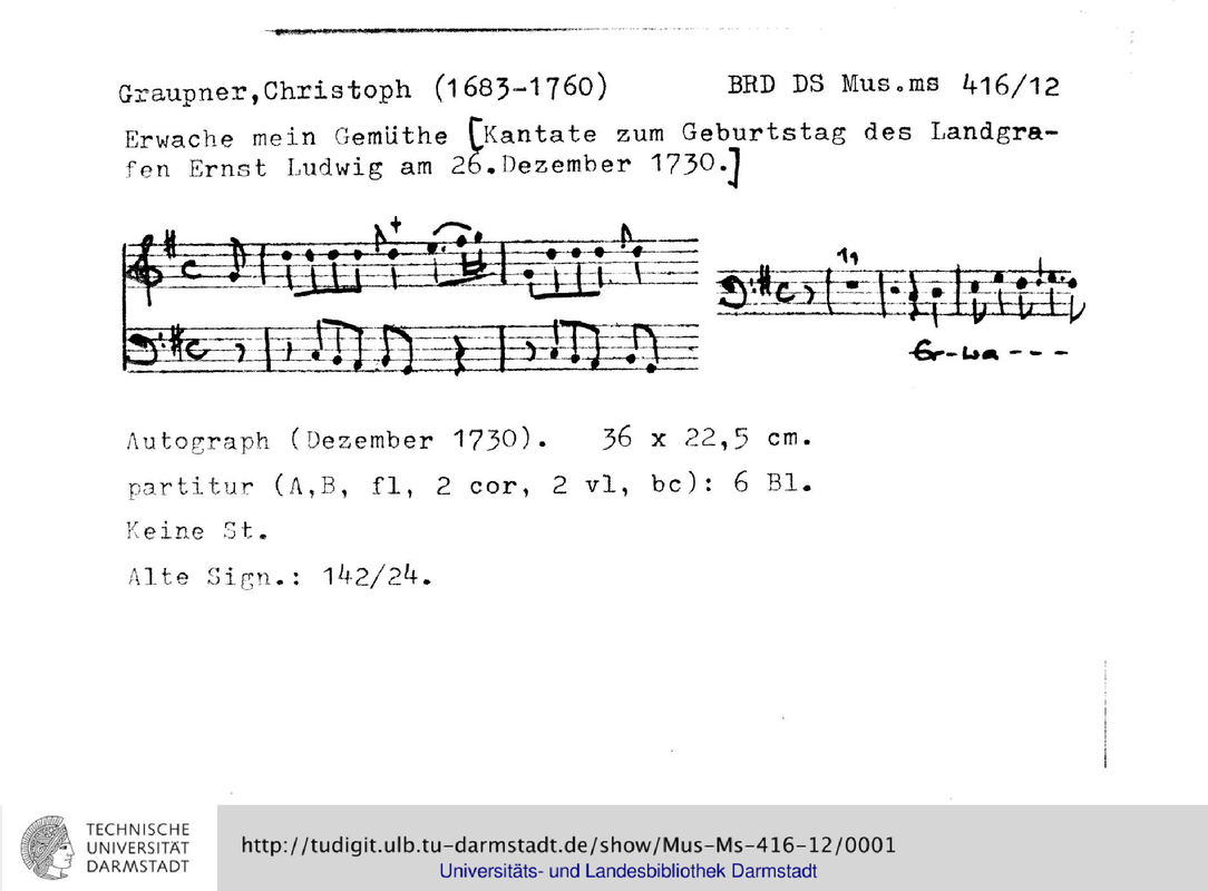 | Alternative. Title | Kantate zum Geburtstag des Landgrafen Ernst Ludwig am 26.Dezember 1730 |