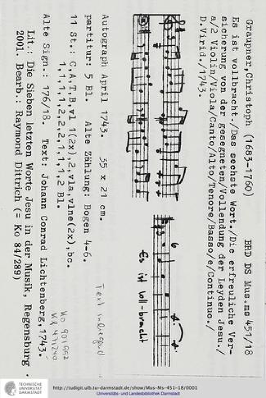 | Work Title | Es ist vollbracht, GWV 1126/43 |
