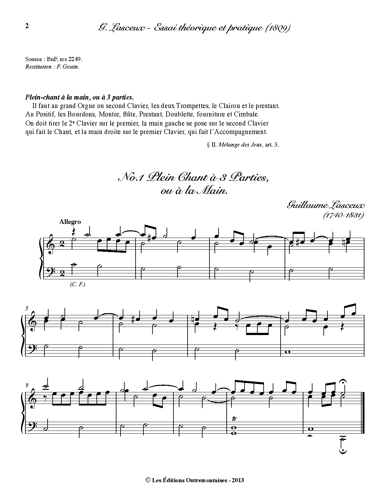 - Essai Théorique et Pratique sur l’Art de l’Orgue. Énumération des Jeux dont ce grand Instrument est composé; manière de les mélanger et de composer les morceaux qui lui sont propres. Précédé de Recherches sur l’Origine de l’Orgue, de Réflexions sur sa dignité, et suivi d’Exemples notés. Par Mr. Lasceux / Organiste de l’Église Paroissiale de St. Étienne-du-mont. / À Paris. / La partie littéraire a été rédigée par Mr. Traversier, Amateur d’Orgue, Membre de la Société Académique des Enfans d’Apollon. 1809. Copié de la Main de l’Auteur et donné à la Bibliothèque des Menus-Plaisirs (du Roi) et de l’École Royale de (Musique et de Déclamation) par lettre du même à Mr. l’Intendant [...] en date du 8 aoust 1819. (signatures)</span>