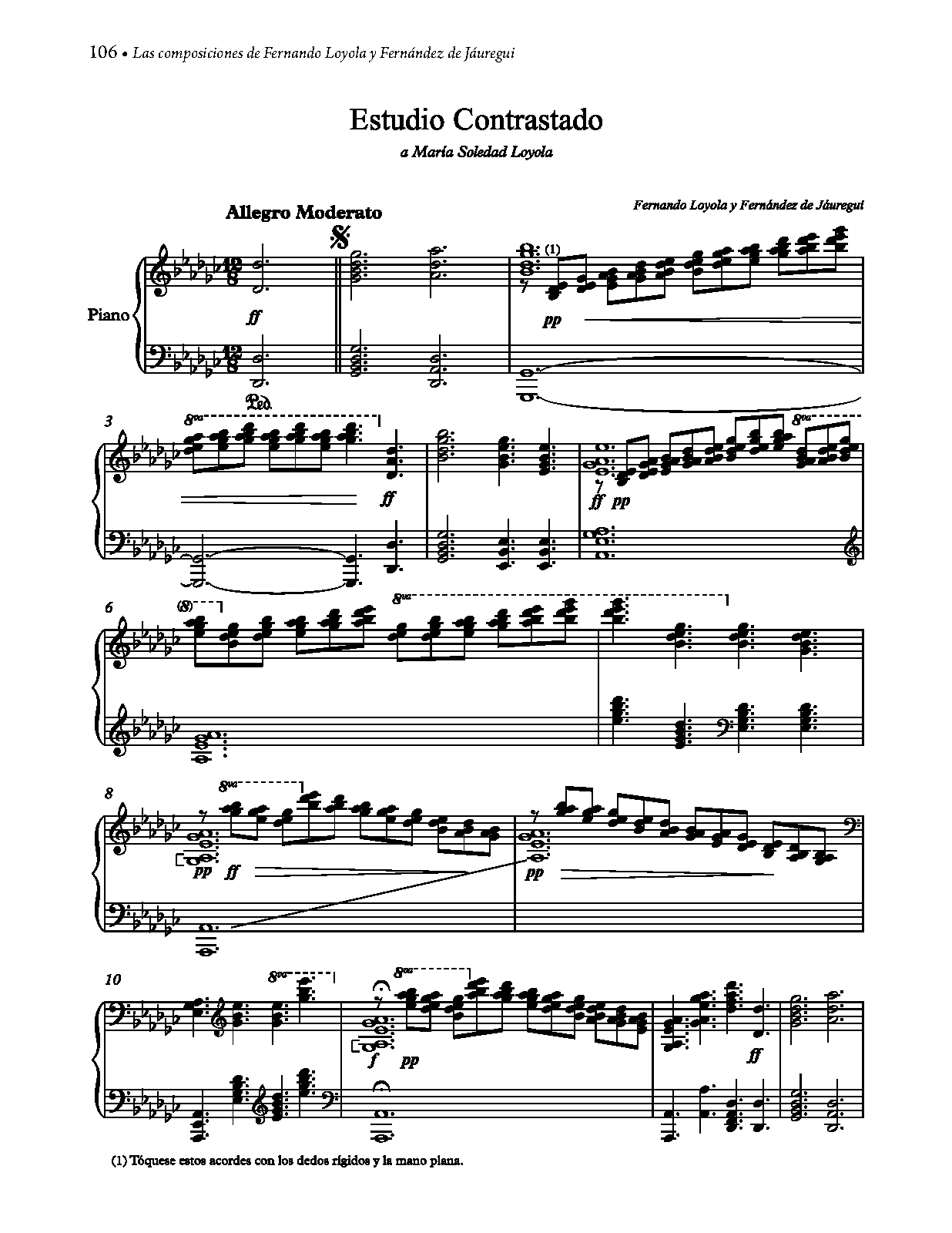 | Extra Information | Estudio publicado en el álbum #2 con obras para piano y canto, en que ingeniosamente las secciones se interpretan utilizando sólo las teclas negras o blancas del teclado, este recurso ya había sido utilizado por Stravinsky en los dos primeros solos de la consagración de la primavera, el fagot con las notas correspondientes a las teclas blancas del piano y el corno inglés a las negras, pero desconocemos si Loyola era consciente de esto. |