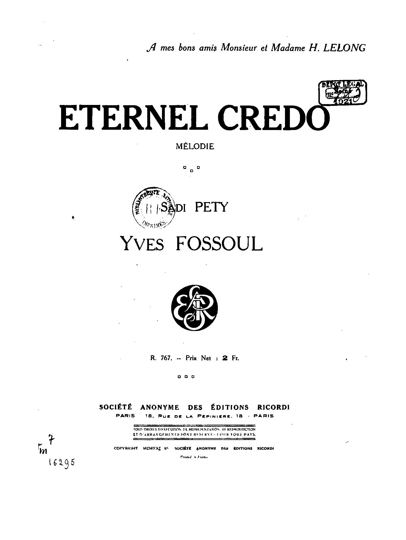 | Dedication | à mes bons amis Madame et Monsieur H. Lelong |