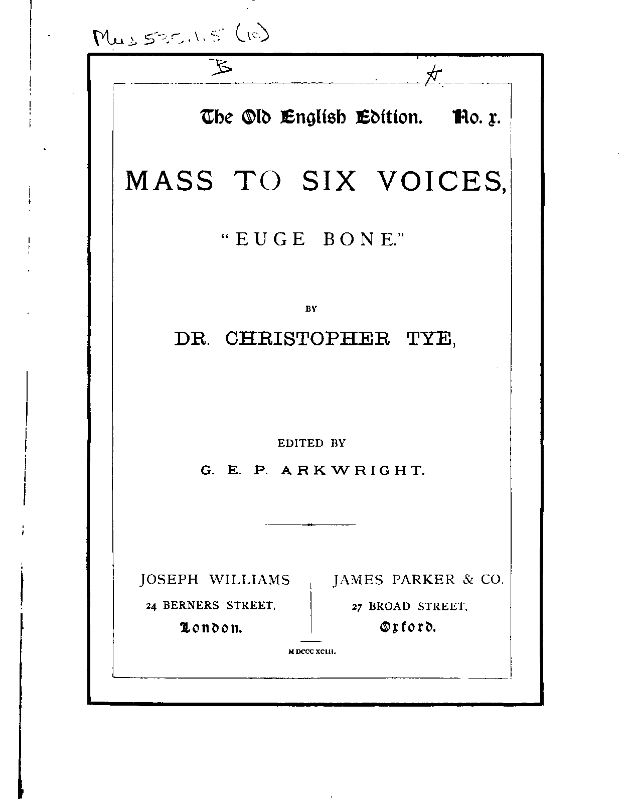 The Old English Edition. No.10. London: Joseph Williams, Oxford: Parker and Co., 1893.