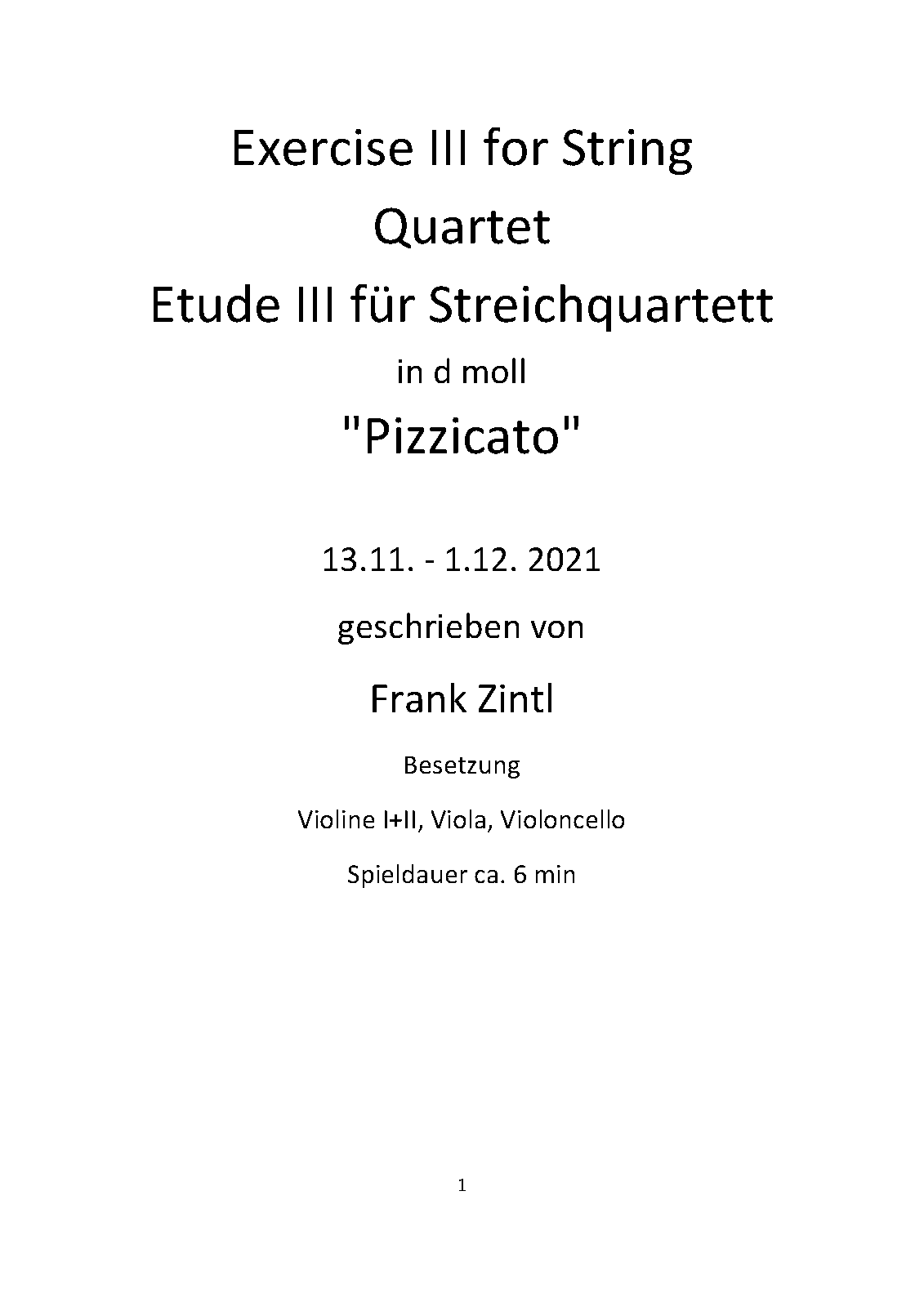| Extra Information | For free use. Frank Zintl wrote this piece for string quartet 13 November to 1 December 2021, with last improvements made 3 December. It is more an exercise in writing than a real work. In this single movement for string quartet the pizzicato effect is explored. The piece itself is in a calm moderato in d minor. The duration is a little longer than 6 minutes. |