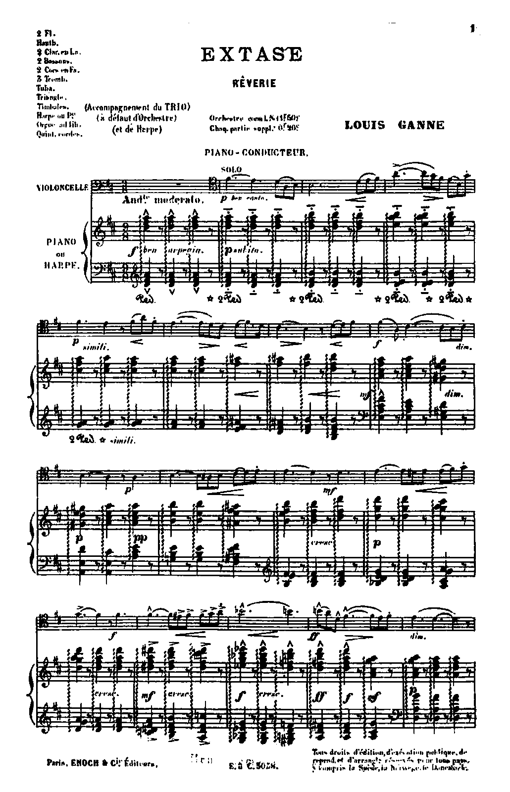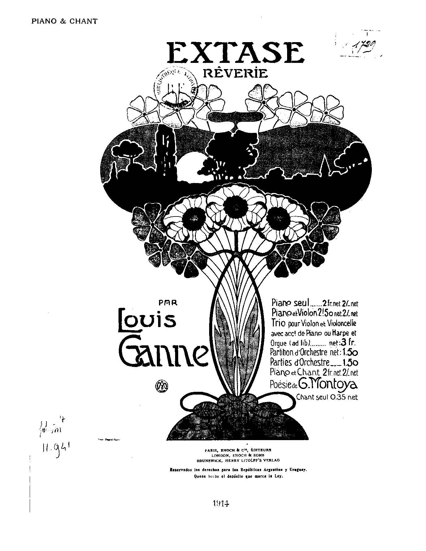 May also exist as a song "Extase, Reverie" for voice and piano (different work? or else earlier? later? than this one?...) (later, apparently- ©1914- a version is being digitized @ BNF it seems, so should be checkable.)