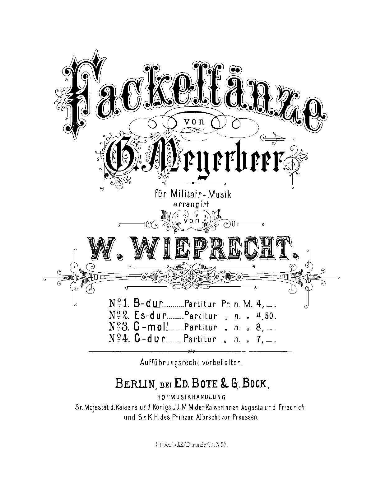 | Alternative. Title | Fackeltänze; Fackeltanz zur Vermählungsfeier Sr. Majestät des Königs von Bayern mit Ihrer K.H. der Prinzessin Marie von Preussen; Fackeltanz zur Vermählungsfeier Seiner Majestät des Königs von Bayern mit der Prinzessin Wilhelmine von Preussen |