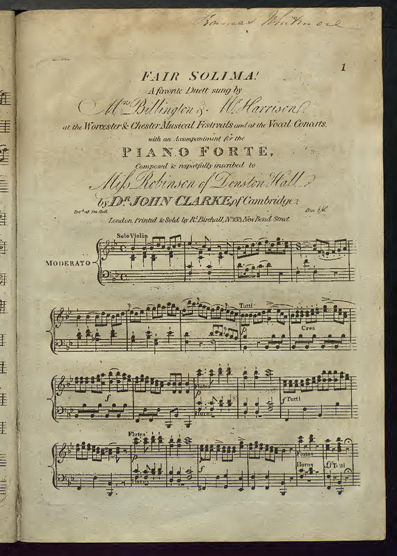 Fair Solima! A favorite Duett sung by Mrs. Billington & Mr. Harrison at the Worcester & Chester Musical Festivals and at the Vocal Concerts, with an Accompaniment for the Piano Forte