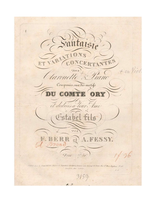 Monatsbericht (1829), p.72 suggests that the violin part was arranged by Alexander Brand and Monatsbericht (1829), p.71 lists a Fantaisie et variations concertantes sur des motifs du Comte Ory for violin and piano by Brand and Fessy.