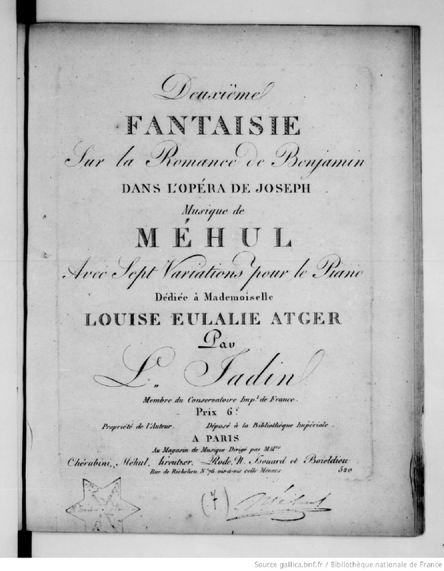 | Alternative. Title | Deuxieme Fantaisie sur la Romance de Benjamin dans l'opéra de Joseph, musique de Méhul, avec Sept Variations pour le Piano ... par L. Jadin |