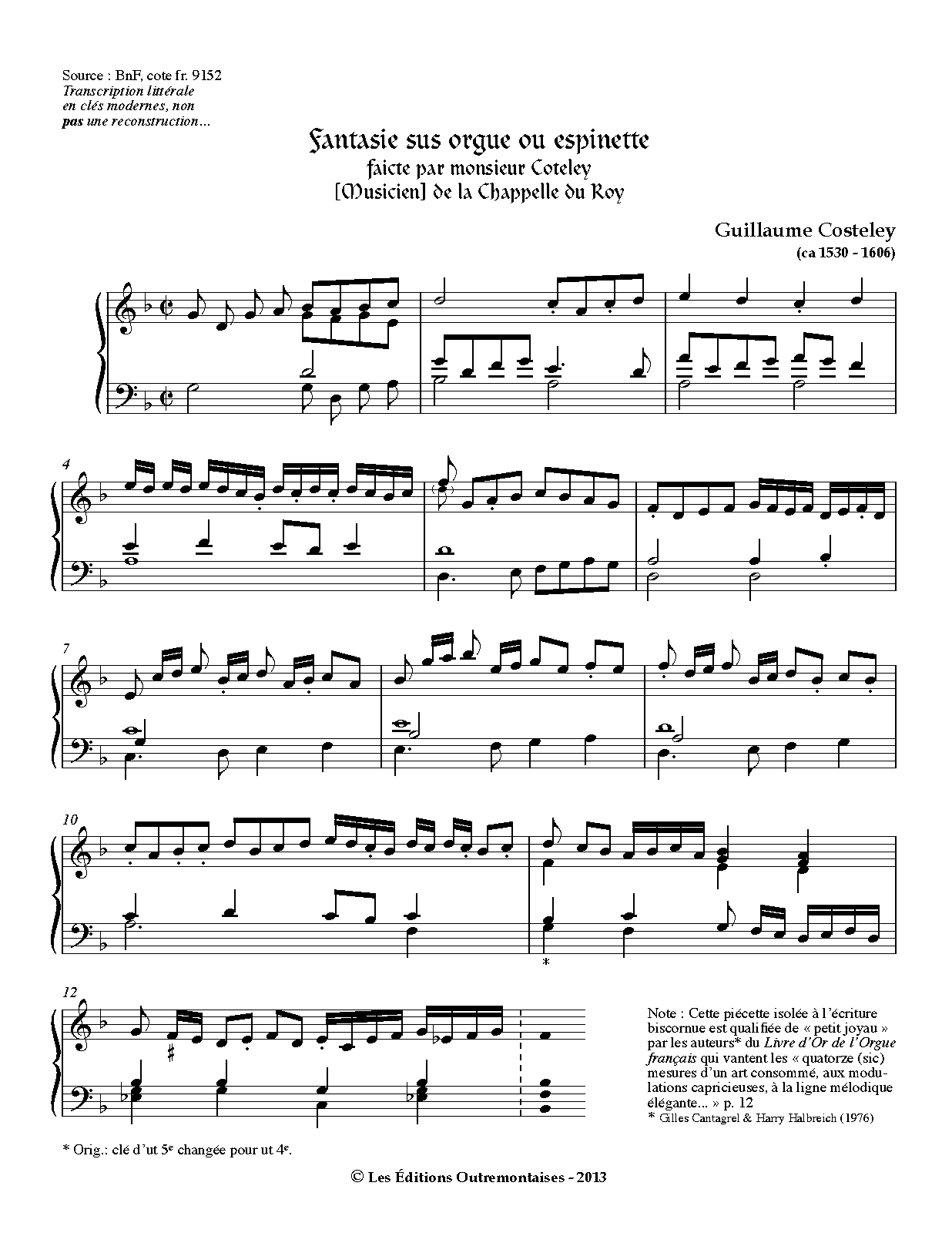 "The only known keyboard work of this ‘organiste ordinaire’, a 12-bar Fantasie sus orgue ou espinette (possibly a fragment), would scarcely deserve notice were it not for the fact that almost no French keyboard music survives from Costeley’s lifetime – and most of that is arranged from vocal originals. Yet tentative reconstructions of the fantasy, which is preserved in an incredibly garbled manuscript apparently written by a non-musician, reveal none of the idiosyncrasies of Costeley’s style and shed little light on the missing repertory of the many French keyboard players of the period." Irving Godt. "Costeley, Guillaume." Grove Music Online. Oxford Music Online. Oxford University Press, accessed February 6, 2013.