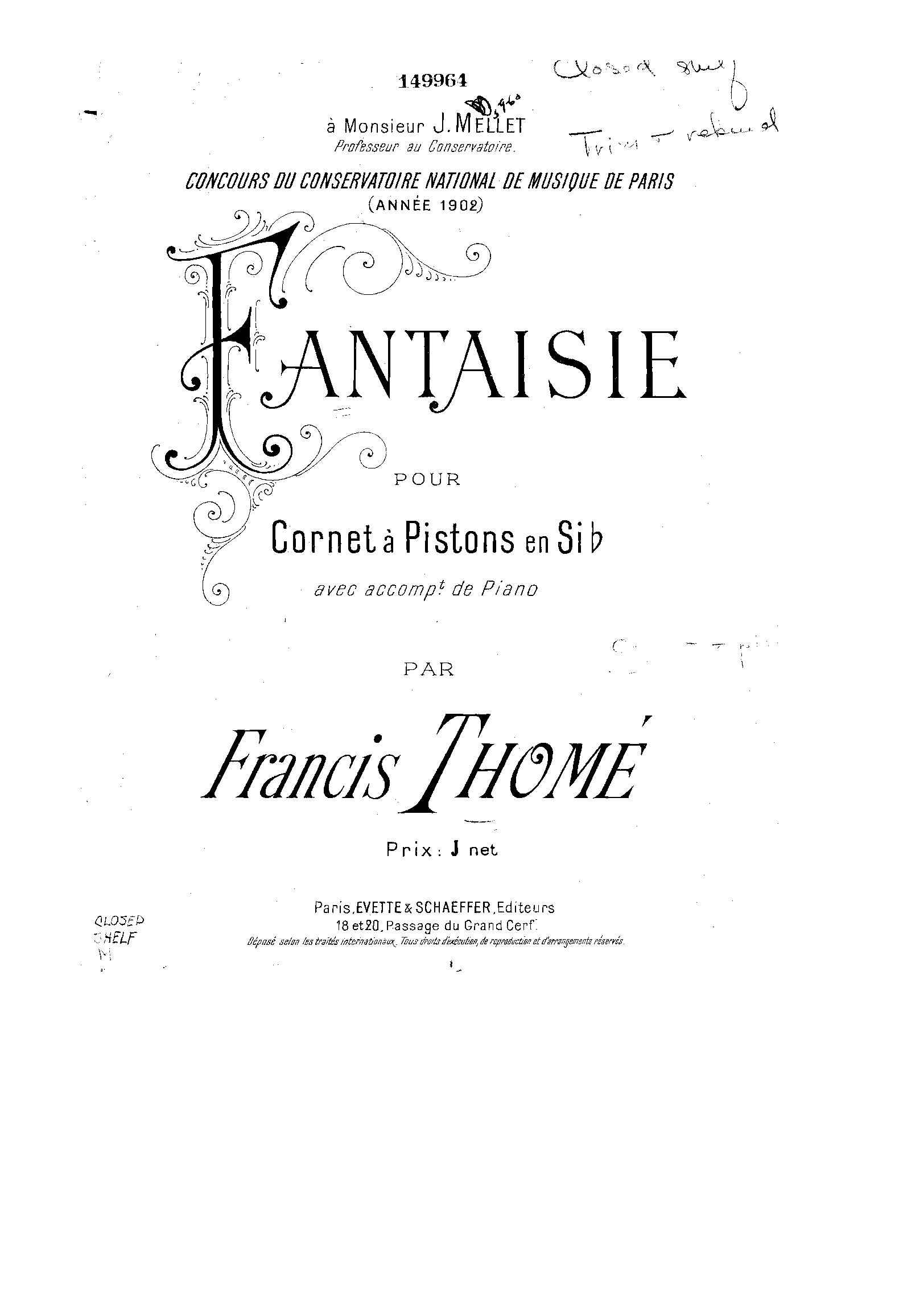 | Alternative. Title | Fantaisie pour cornet à pistons en si♭ avec accompt. de piano. |