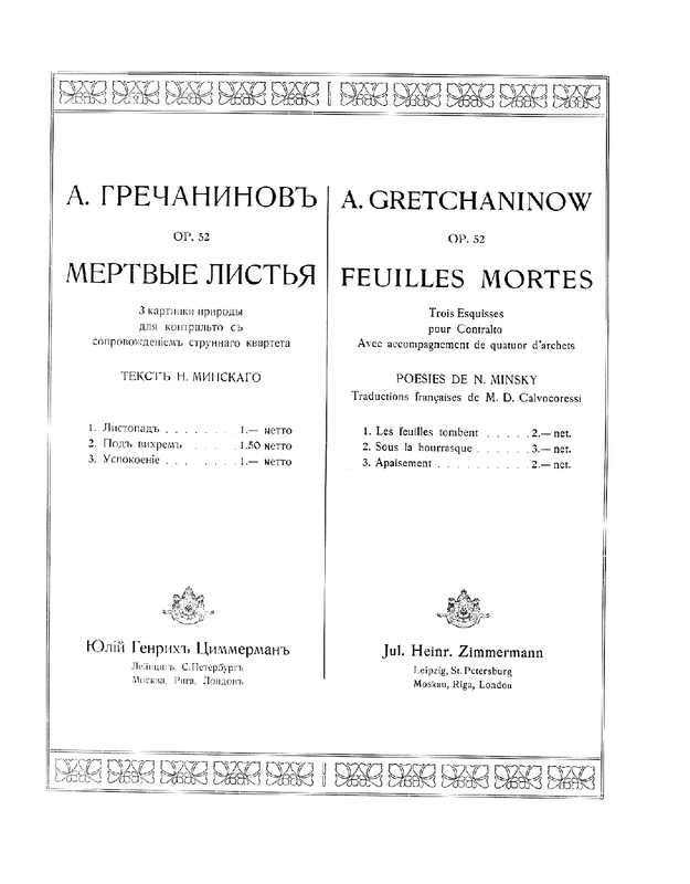 | Alternative. Title | Trois esquisses pour Contralto avec accompagnement de quatour d'archets Мертвые листья; 3 картинки природы для контральто с сопровождением струнного квартета |