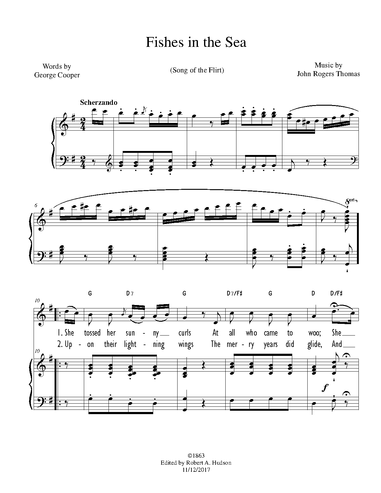 George Cooper got two-for-one on this song. He wrote a poem called "There Are Plenty of Fish in the Sea" and sold it to Stephen Foster. Horace Waters published it in 1862. Then he changed the words a little bit and sold it again to Thomas who published it as "Fishes in the Sea" in 1863.