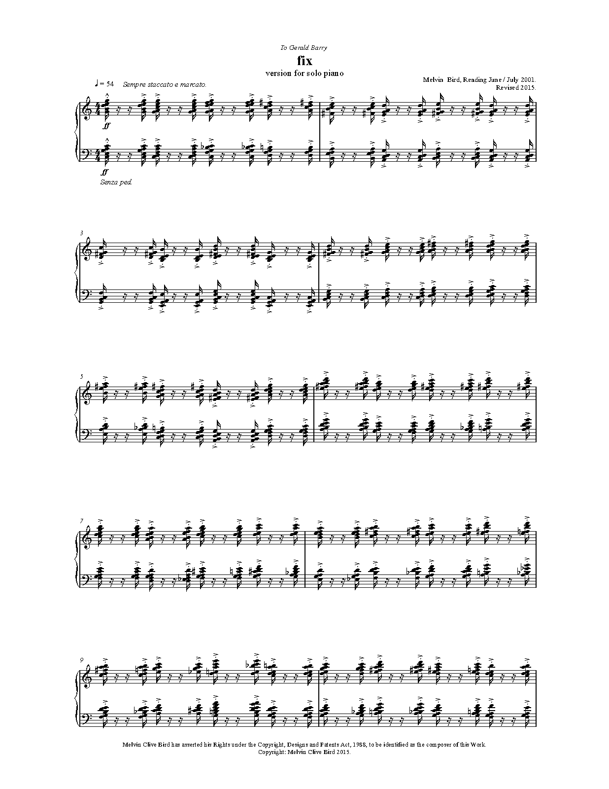Melvin Bird has asserted his right under the Copyright, Designs and Patents Act, 1988, to be identified as the composer of this work. Please contact the composer for further information. The composer welcomes any performances and recordings. melvin.bird@hotmail.com. A clear and clean text.