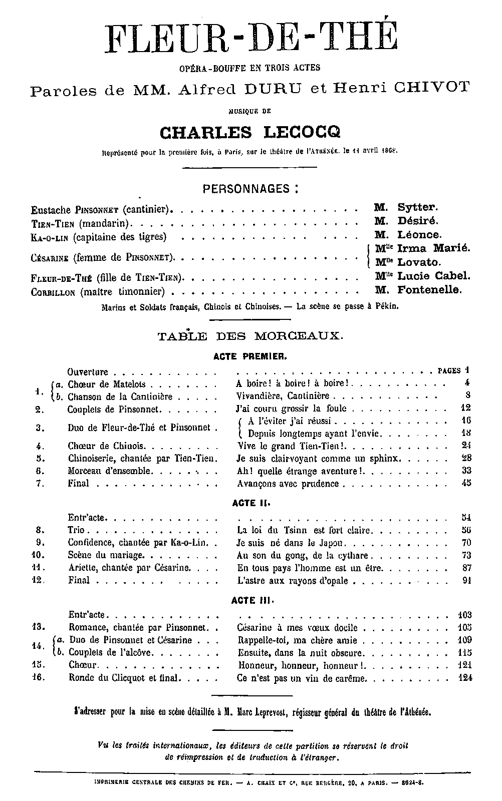 | Copyright Information | Publication noted in the Bibliographie de la France : 57e année, 2e série, Nº 26, 27 Juin 1868, p.306, reg.1919 (vocal score). |