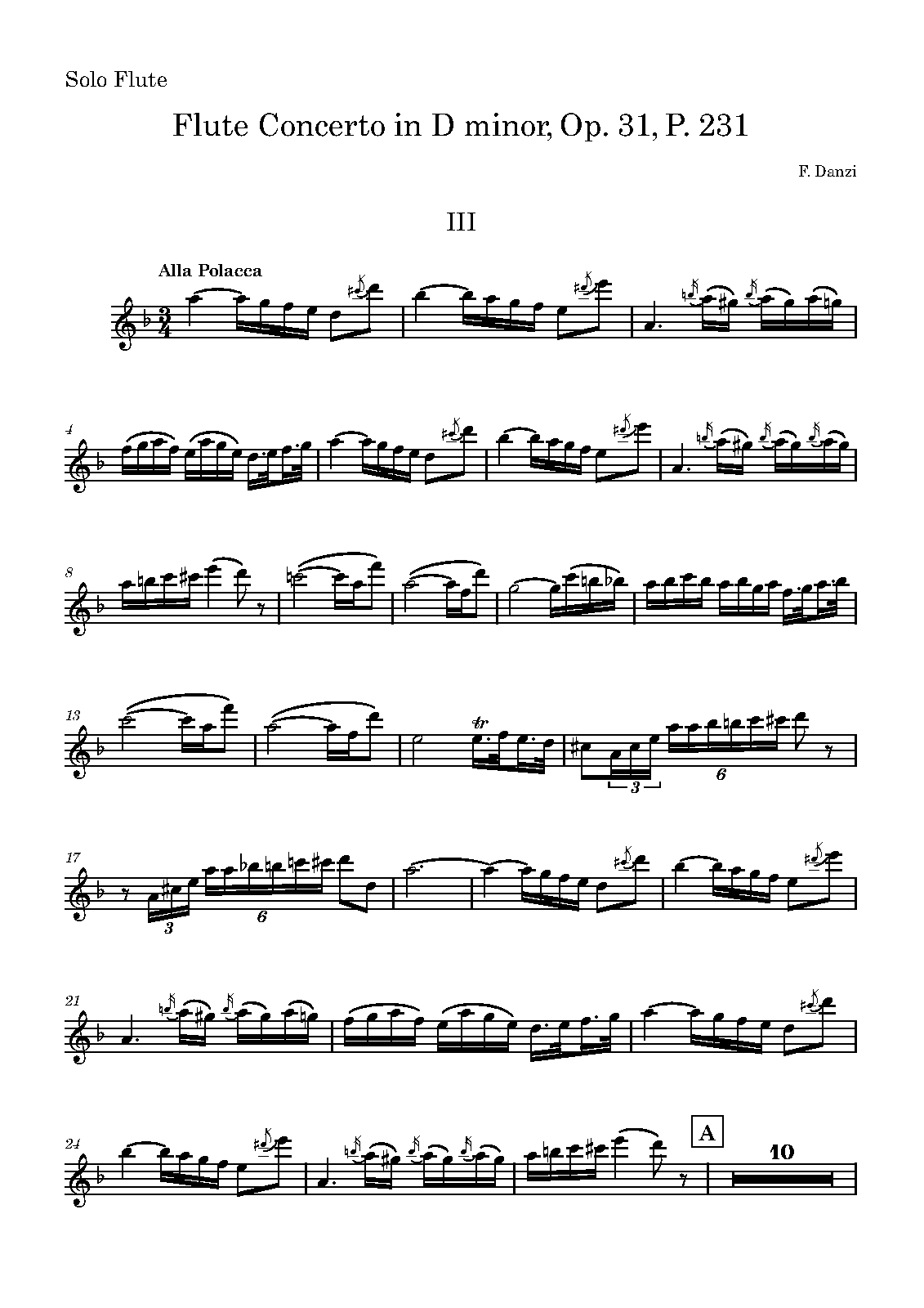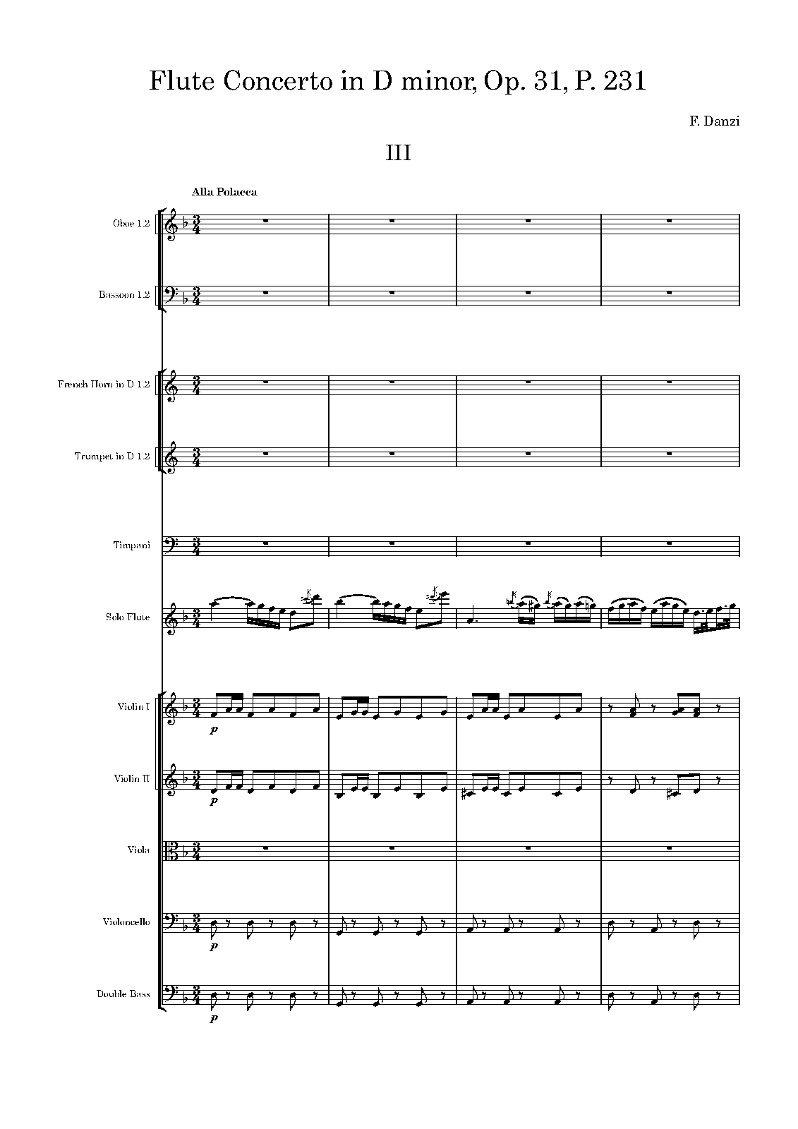Solo: flute Orchestra: 2 oboes, 2 bassoon, 2 horns in D, 2 trumpets in D, timpani strings
