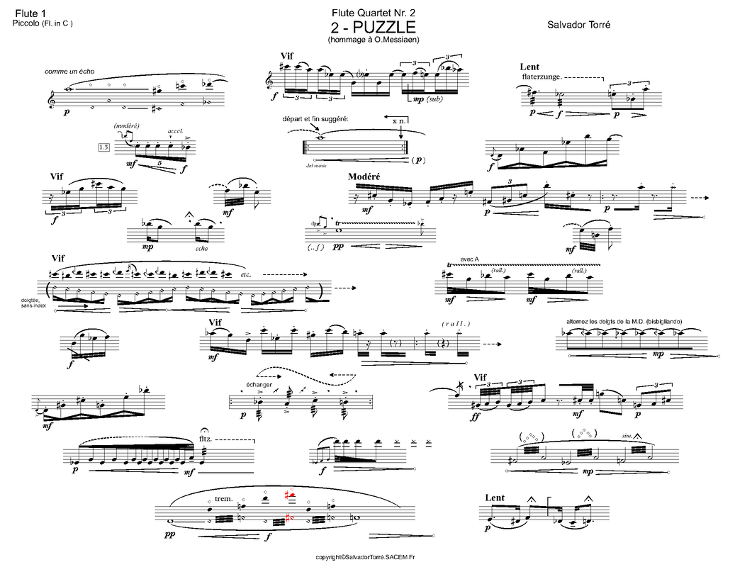 Flute Quartet No.2 'Homm-ages' - the flutists have to be spatialized in the concert hall. Homm-ages are several tributes to the twentieth century composers who were pioneers of various musical revolutions, they are little musical pieces each one devoted to one or more composers applying the technique that each composer utilized, for example: Cage utilized star maps to compose, hence a constellation is formed, Messiaen was inspired by the birds singing and their intricate rhythms, Berio used a novel space-time writing but that space-time was already inherent in musical notation invented by Guido D'Arezzo in the year one thousand. Reich uses a melodic cell repeated ad infinitum but it changes imperceptibly. With all this we find that these procedures existed in other eras of history of music but under a different light. Each musician plays each of these pieces of (almost) -independent, so that each piece or movement is a kind of "collage" in which the piece overlaps itself, this overlap must be set to the sound space thanks to which musicians are placed in different parts of the concert-hall spreading sounds among the public, providing distance and location of sound sources in a three dimensional space.
