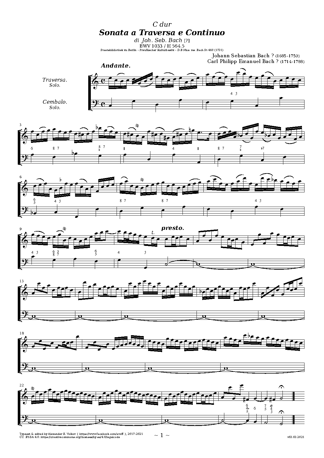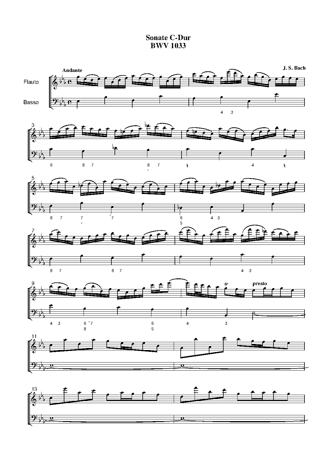 Name Aliases Sonata for Flute and Continuo in C Major, BWV 1033; Bach, Johann Sebastian, 1685-1750. Sonatas, flute, harpsichord, no. 4, C major; Bach, Johann Sebastian, 1685-1750. Sonatas, flute, guitar, BWV 1033, C major