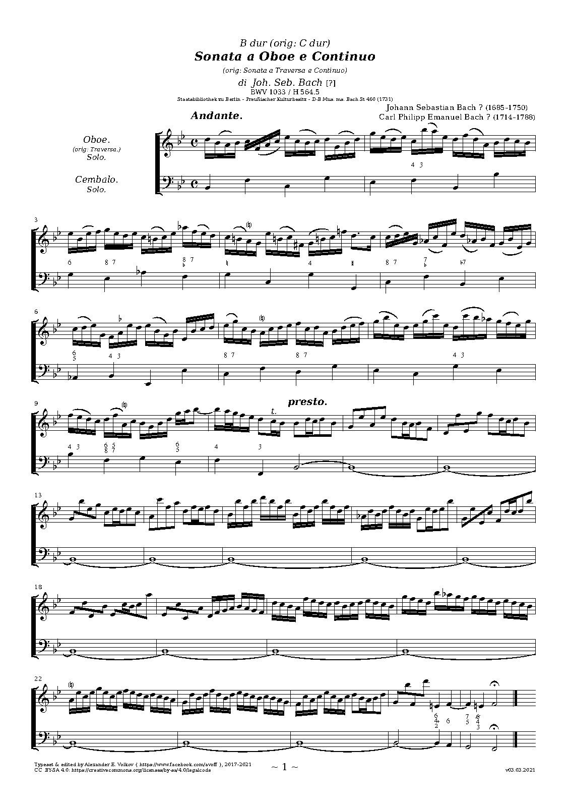 Opus/Catalogue NumberOp./Cat. No. BWV 1033 ; H 564.5