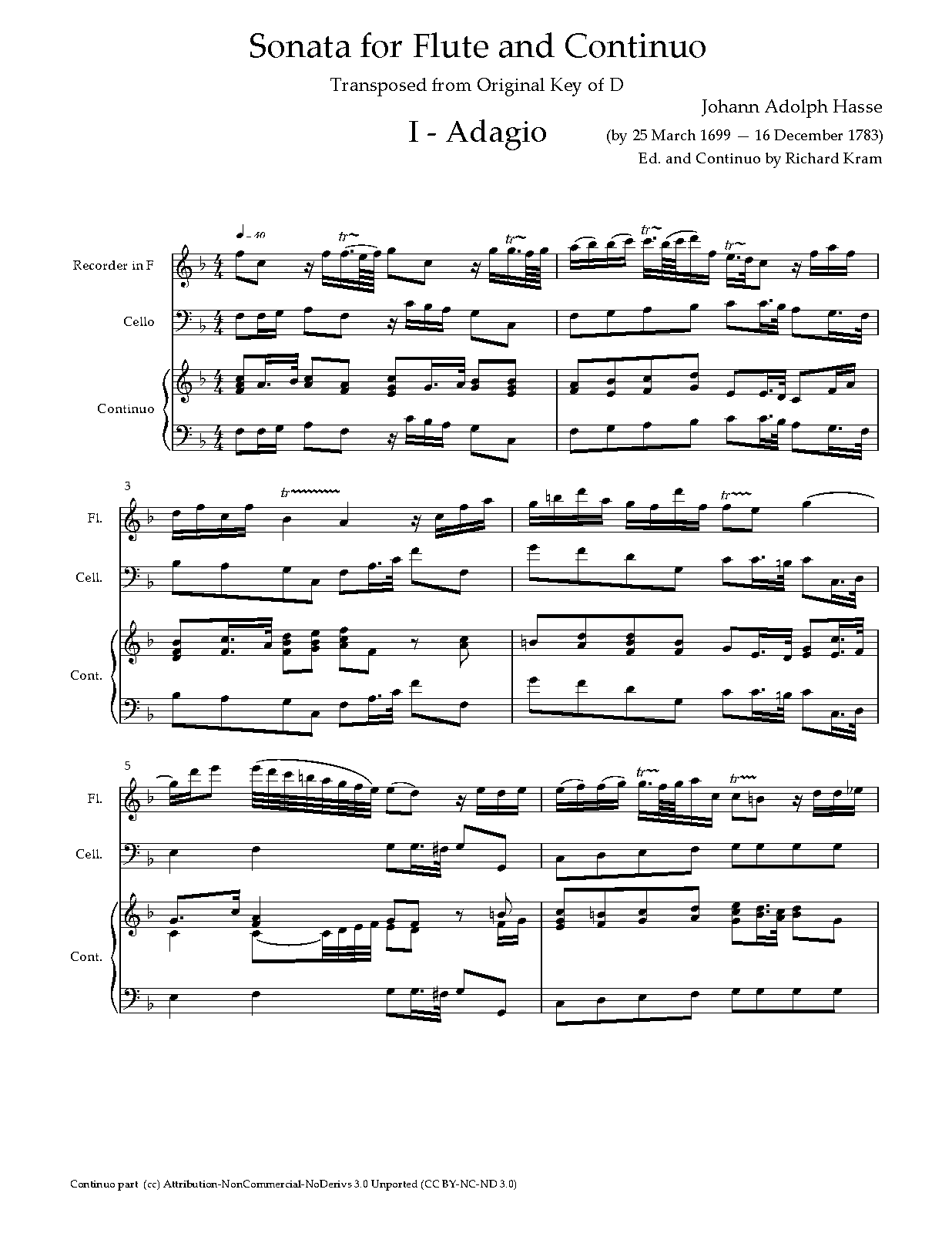 Too nice piece to just sit in manuscript. Edited it and added a realized continuo. Only a few measures of the first movement had a figured bass so I did not notate one. Recorder transcription posted on the Arrangements and Transcriptions tab. Complete Parts as separate files for each movement zipped up. Created in Notion which is not he best for engraving, but the parts are perfectly readable. XML also posted for those who want to make their own editions or continuo modifications.