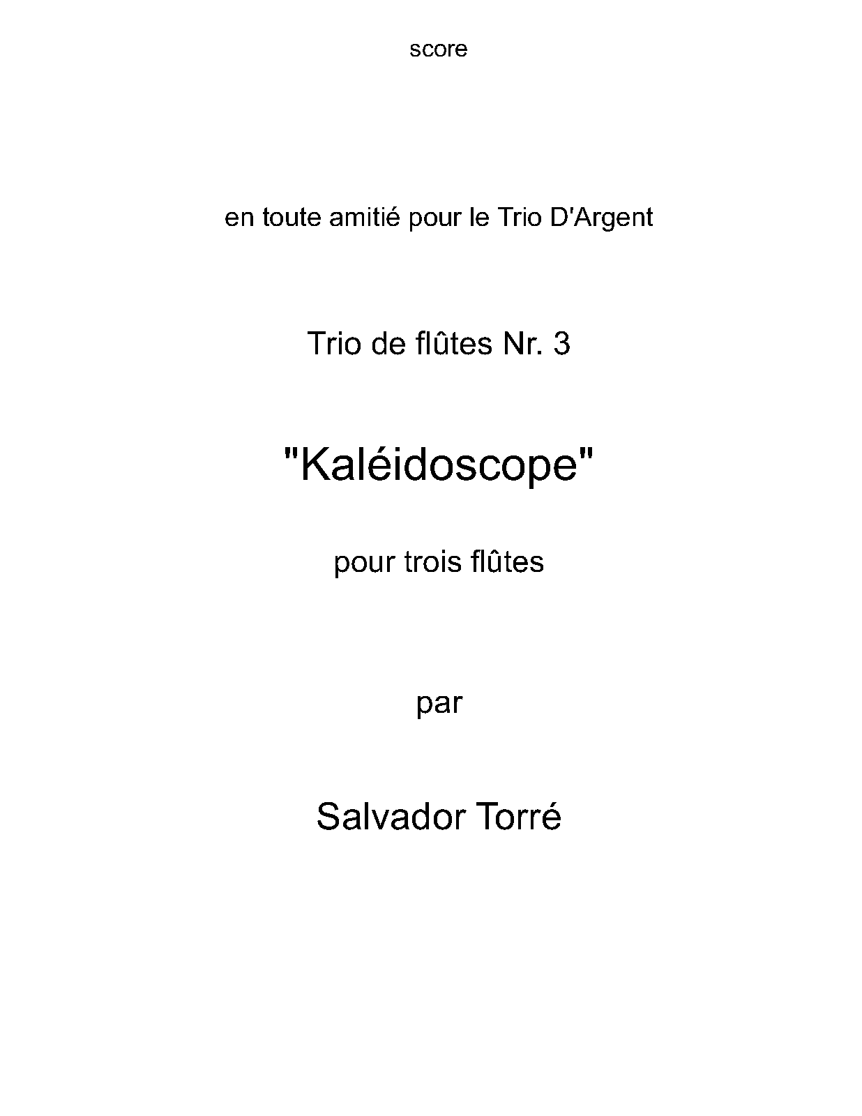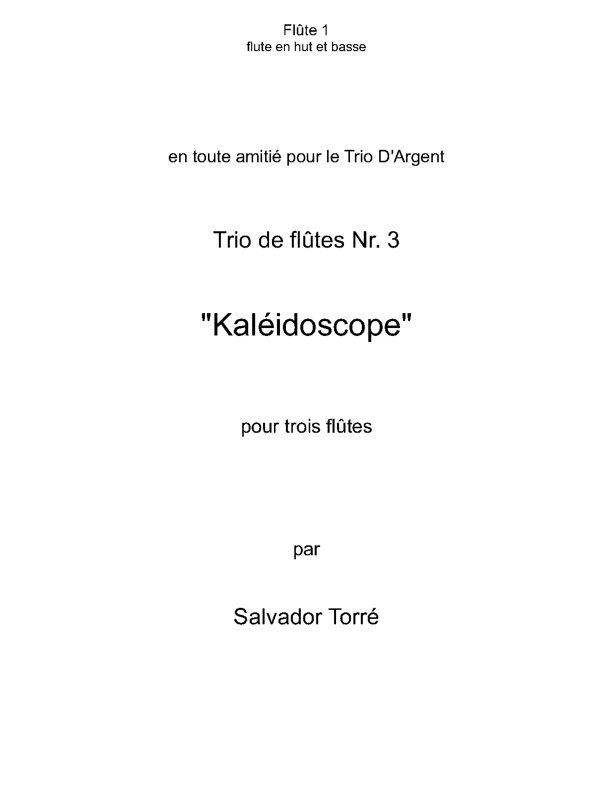 Kaleydoscope (Flute Trio Nr.3) The work is based on the song of the goldfinch, which is in no rush to scan their song gradually and slowly throughout, tracing its accelerating perfect to spread so slowly that you never know what time came into existence, for its song confused with the soundscape, and then, in the confines of this rapid accelerating, jumping off the cliff in a cascade of multiple wide of colors, deployment falls infinitely bright, very complex descending arpeggios, concentric kaleidoscope of lights ... and ultimately it resonates resonates deep in the woods ... in silence ... But this music in any way want to be descriptive, not the song of the goldfinch is what we are listening, All this operates trhoghout filters in our perception, this soundscape is only the detonator of an imaginary perceptual and musical abstraction that hovers in freedom of imagination, being able to project, like a kaleidoscope, our imagination, our own freedom of thought which arises spontaneously but deep within us.