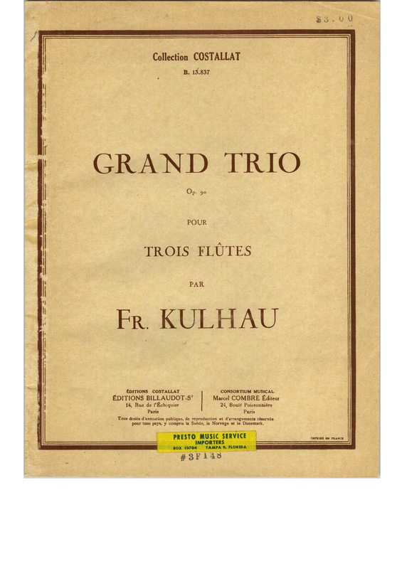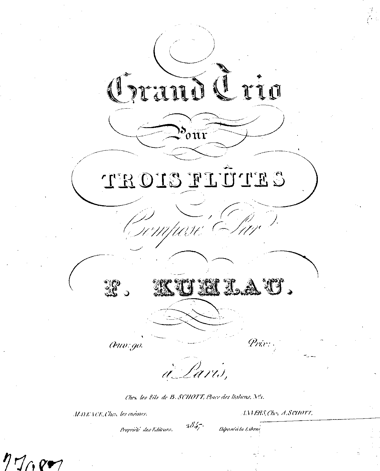 Publication noted in the Bibliographie de la France 1e série, 17e année (31e de la collection), Nº 42, 18 Octobre 1828, p.768, r.282. seems to be this work (though under "Kumlau" and given just as Grand trio pour 3 flûtes.)