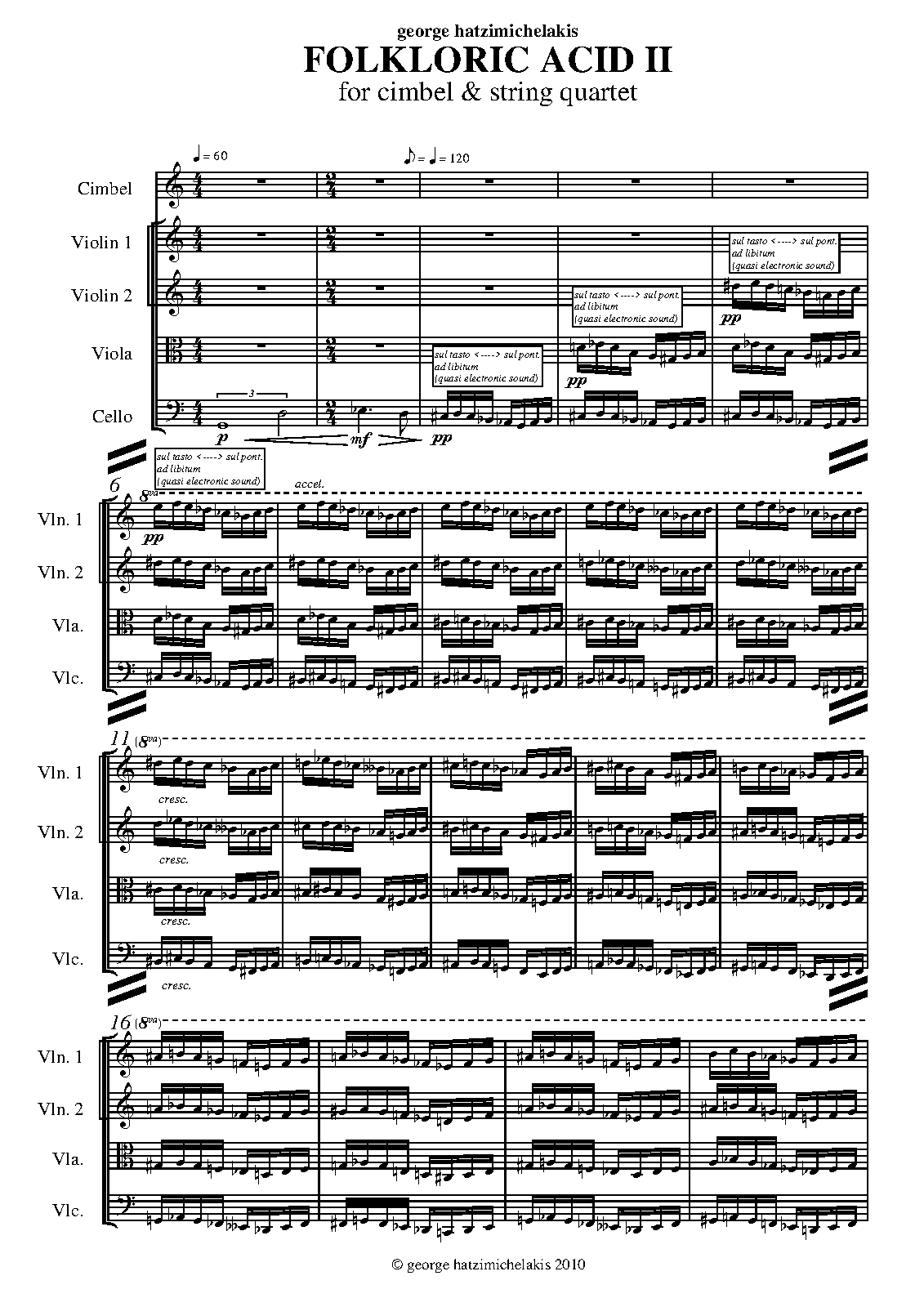 | Extra Information | George Hatzimihelakis' "Folkloric Acid II" for cymbel and string quartet was composed in 2009 and is dedicated to the cymbel soloist Angelina Tkatseva. It was performed for the first time with the +KINISIS quartet (2010) in Athens and Tinos, then by the Hellenic Group of Contemporary Music under the direction of Theodoros Antoniou at the MEGARON - Athens Concert Hall (2012) and on February 13, 2016 with the string quartet L' ANIMA at the Erateio Conservatory (from where the recording is) always with soloist Angelina Tkacheva. The piece belongs to a cycle of homonymous pieces where it explores the coupling of traditional and contemporary music, in areas such as timbre, resonances, phrases and form. |