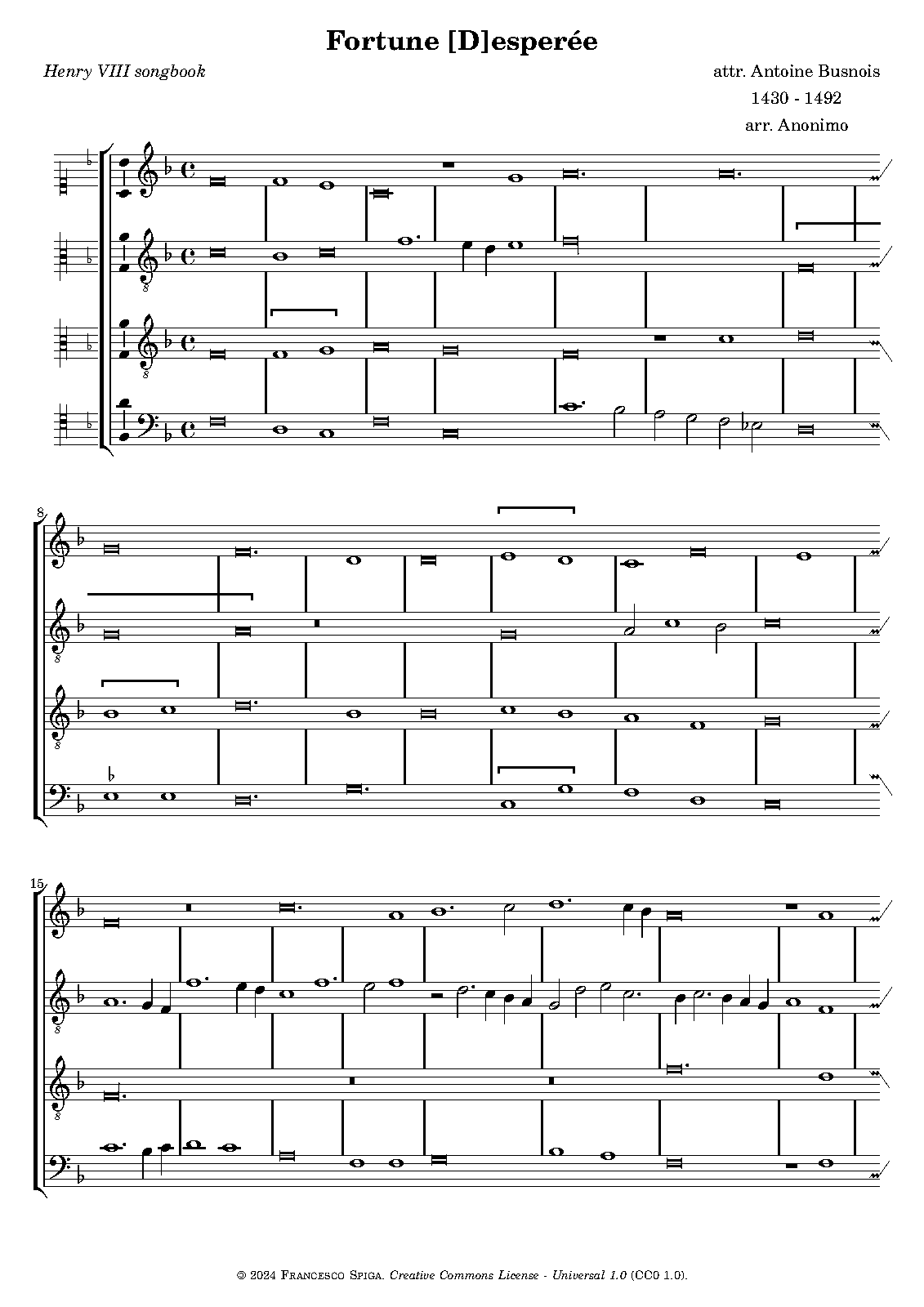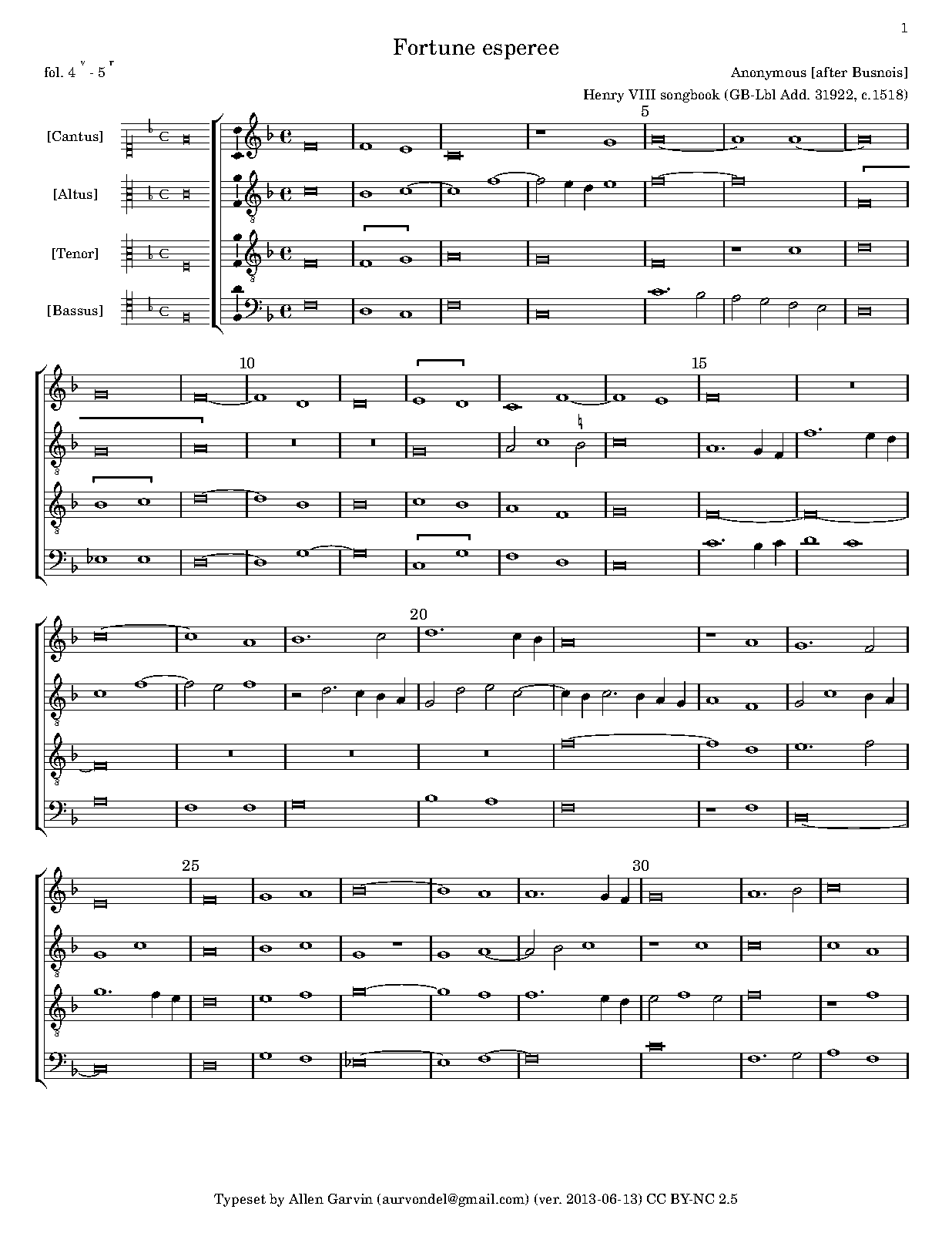 | Extra Information | This anonymous, untexted (except for the incipit "Fortuna esperee") setting of Fortuna Desperata from the Henry VIII songbook (British Library Add. 31922) adds a si placet in the altus to Busnois' 3-voice chanson. |