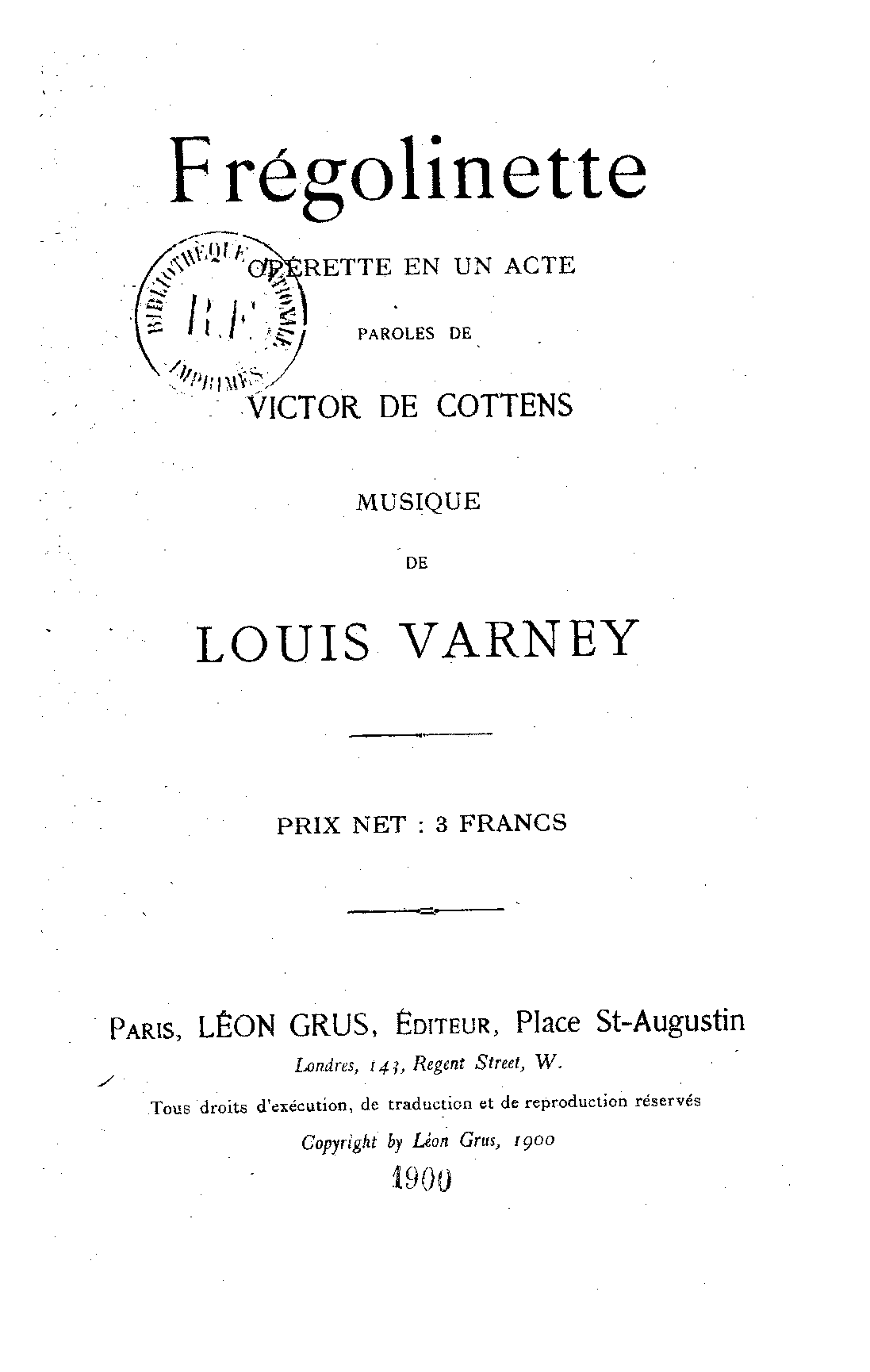 | Copyright Information | Publication noted in the Bibliographie de la France : 89e année, 2e série, Nº 27, 7 Juillet 1900, p.466, reg.3115 (vocal score). |