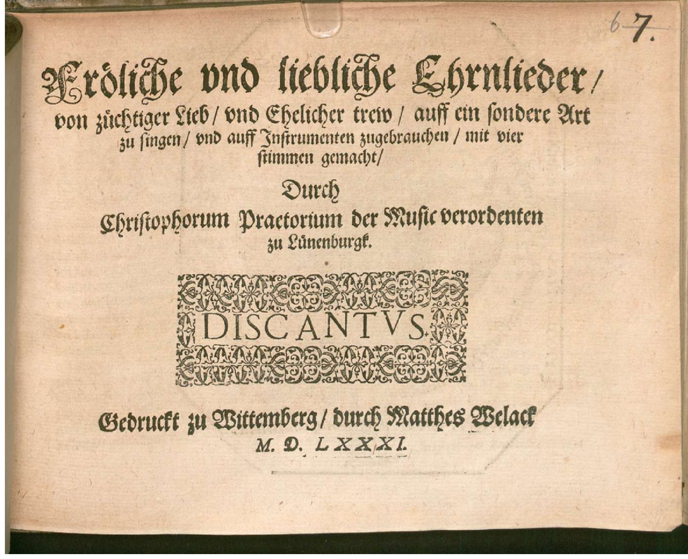 | Alternative. Title | Fröliche und liebliche Ehrnlieder von züchtiger Lieb und Ehelicher trew, auff ein sondere Art zu singen, und auff Instrumenten zugebrauchen, mit vier stimmen gemacht, durch Christophorum Praetorium der Music verordenten zu Lünenburgk |