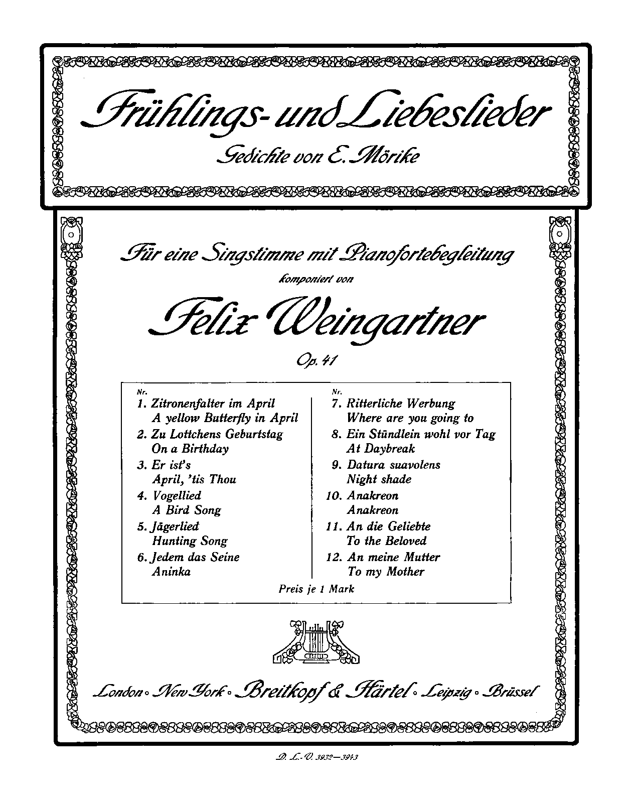 ⇒ 11 more: 2. Zu Lottchens Geburtstag • 3. Er ist's • 4. Vogellied • 5. Jägerlied • 6. Jedem das Seine • 7. Ritterliche Werbung • 8. Ein Stündlein wohl vor Tag • 9. Datura suaveolens • 10. Anakreon • 11. An die Geliebte • 12. An meine Mutter