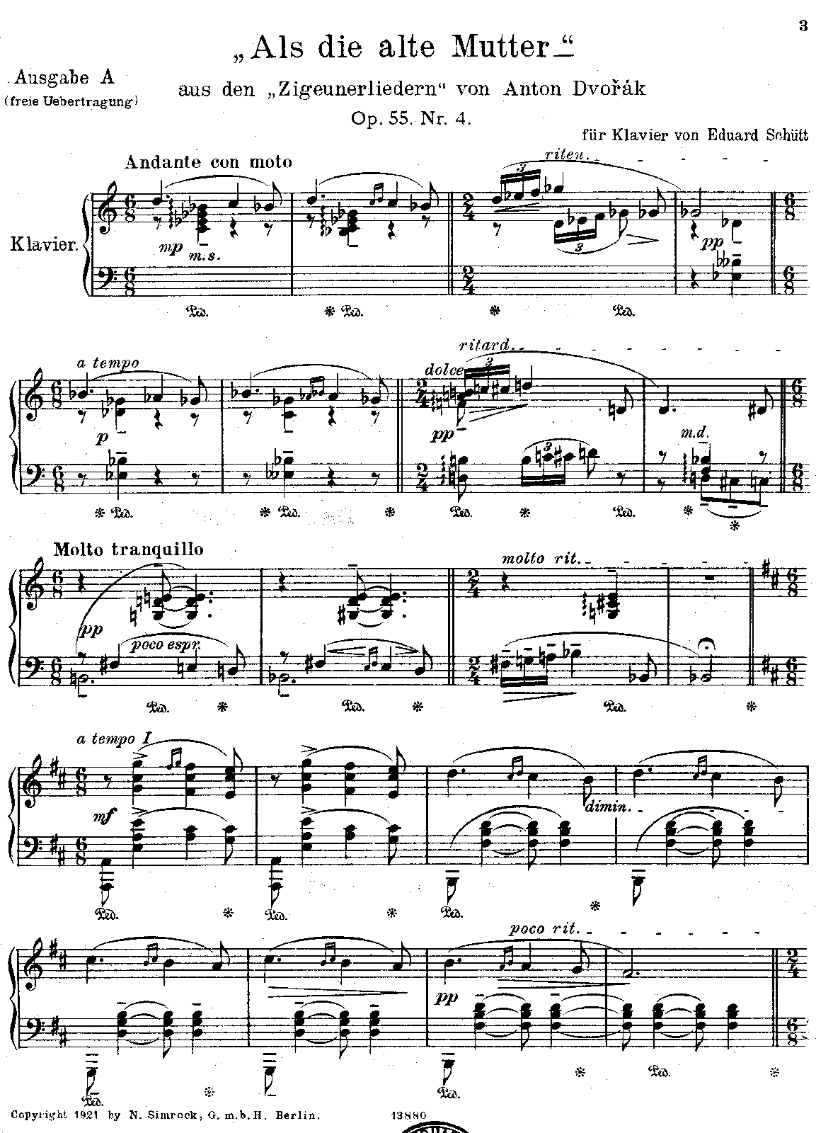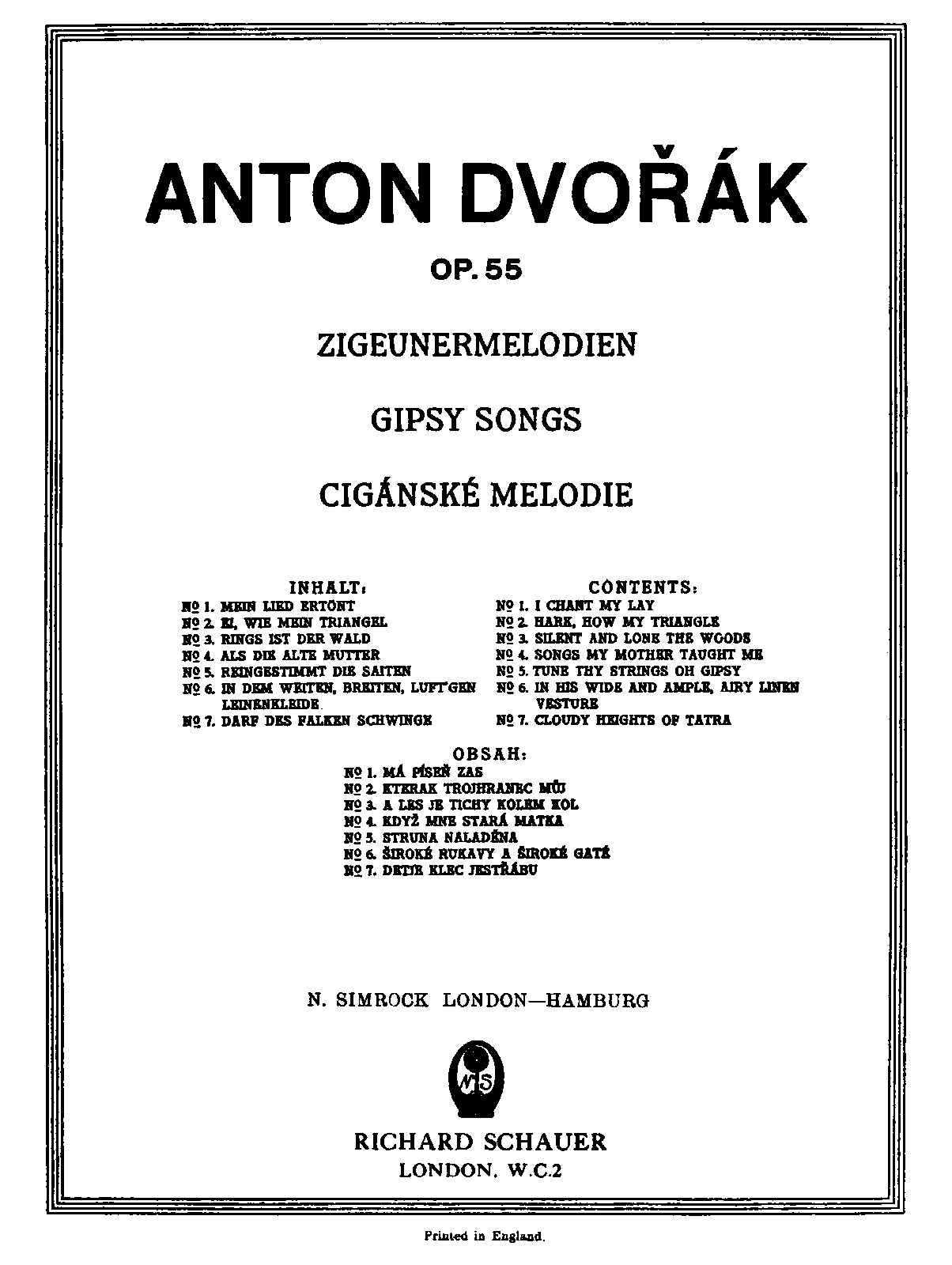 | Extra Information | Heyduk translated his own Czech poems into German. Dvorák set them for the tenor at the Viennese Court Opera, Gustav Walter, in German, and for publication in his own country, with slight alterations only, in Czech. |