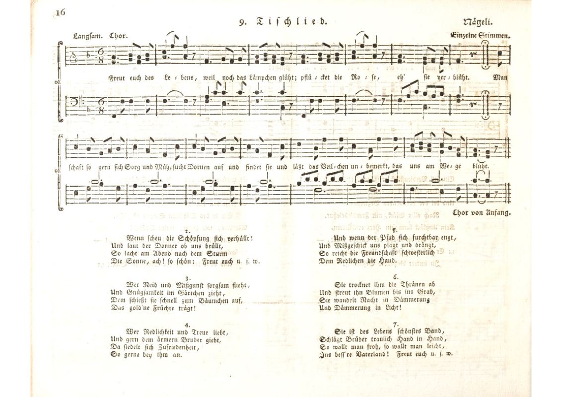 Perhaps the earliest surviving printing of the song appears in Freymaurer Lieder mit Melodien, Book 3, p.16, see also: Der Heimatpfleger "Freu't euch des Lebens"