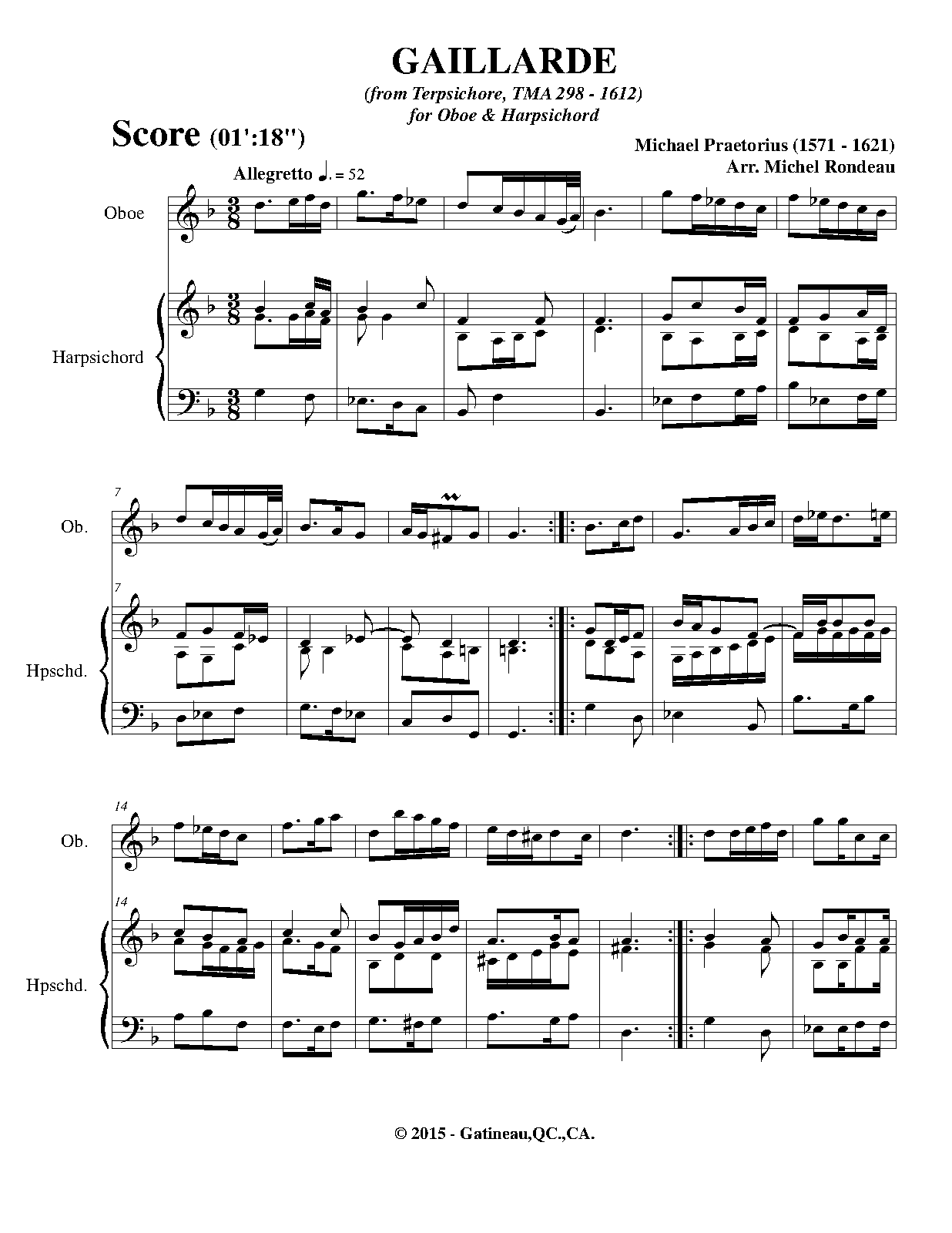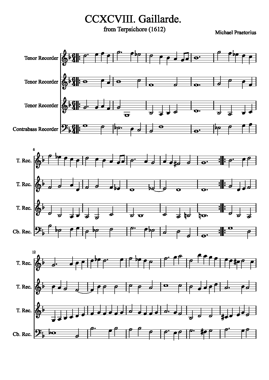 | Extra Information | These pieces were assembled and arranged by Praetorius for his 1612 collection. It is unknown how many, or if any, of the works in the collection were actually composed by Praetorius as opposed to being popular dance tunes arranged by him. The instrumentation is not specified in the original, and simply listed as "Ã 4". |
